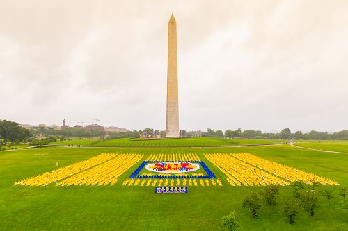 【明慧网二零一八年六月二十三日】(明慧记者英梓、德祥、容法华盛顿DC报道)二零一八年六月二十二日,来自世界各地数千名法轮功学员在美国首都华盛顿纪念碑广场上集体炼功。当天上午,华府是阴雨天气,并一度暴雨滂沱,但是,参加集体活动的学员并没有为天气所动,在风雨中,平和、安静地炼功。身着不同颜色服装的学员队伍排出的法轮图形光彩照人、殊胜无比,他们用纯净的内心和巨大的善意,告诉人们“世界需要真善忍”。今天的场景,正是他们二十年来所走过修炼道路的写照,即使自己经历风雨,也要将“真善忍”的美好带给人间。