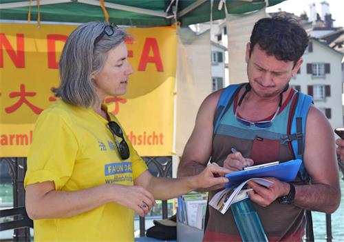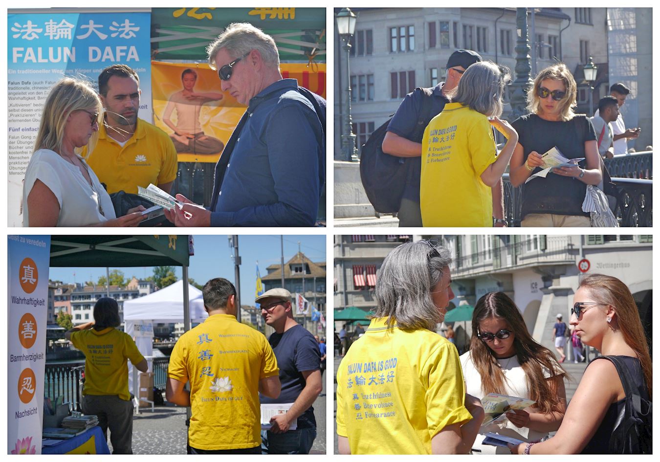 二零一八年六月二十三日,瑞士法轮功学员在这里设立的真相点,组成了特殊的风景线,吸引游客和民众驻足阅读关于法轮功的介绍,观看学员的功法演示及大法弘传世界的照片,了解中共迫害法轮功,甚至活摘法轮功学员器官的真相。