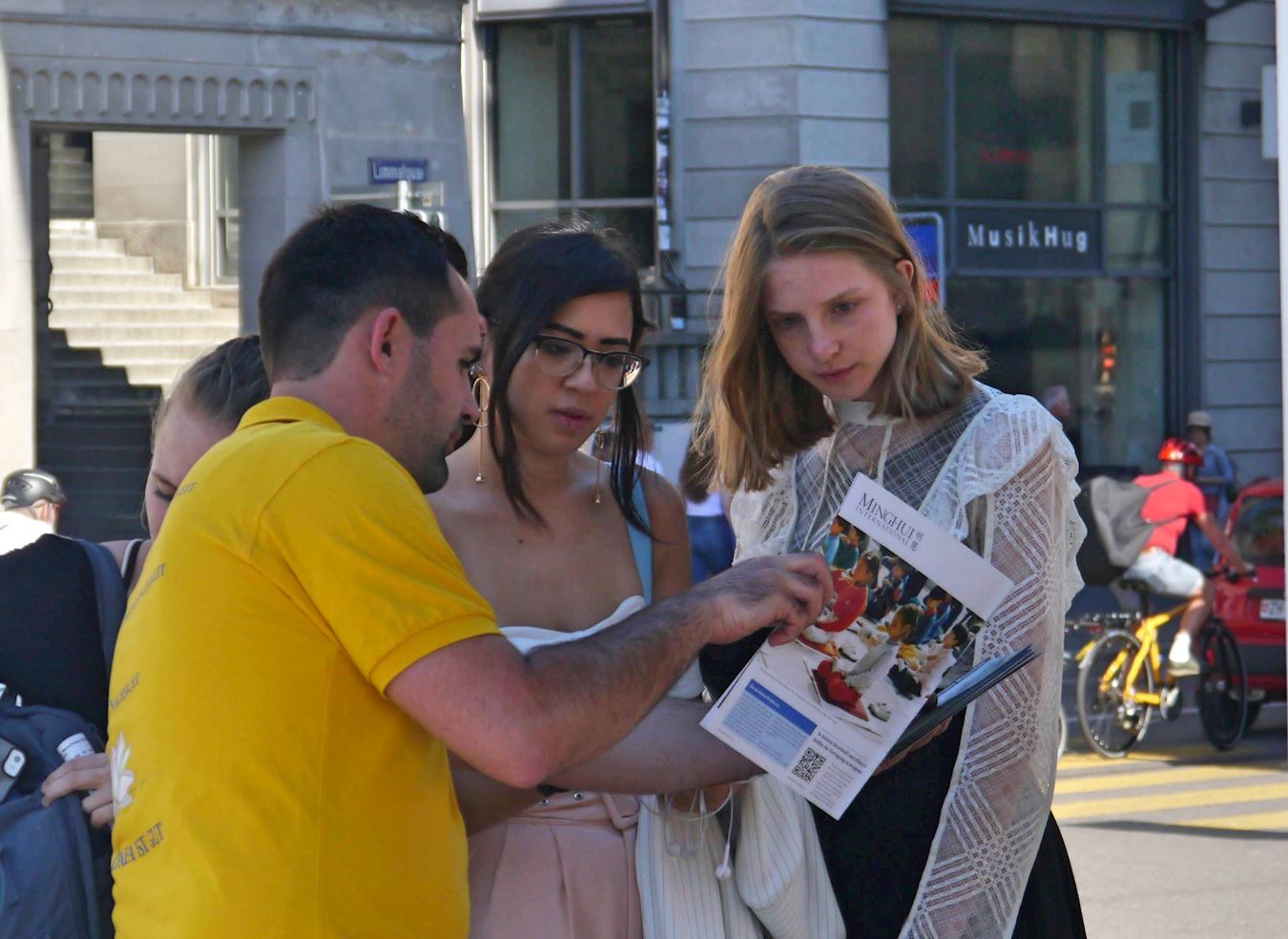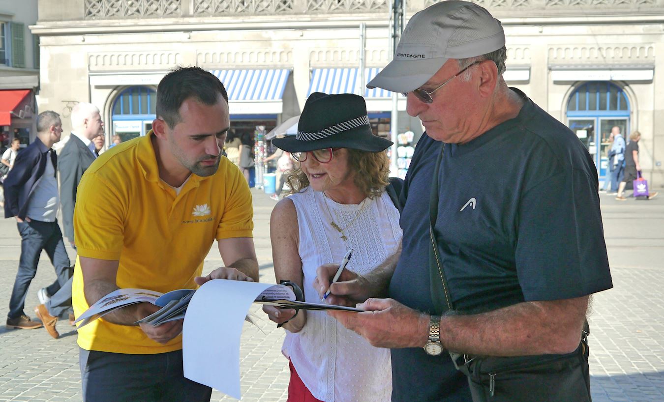 ![]() 图1:二零一八年六月二十三日,瑞士的法轮功学员苏黎世著名景点利马特河畔设立真相点,向各国民众传播法轮功真相。许多民众驻足了解真相。 |