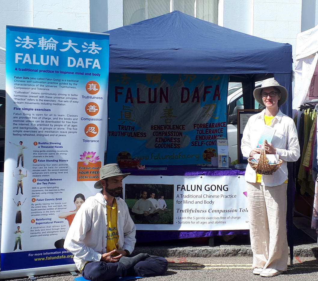 法轮功学员中有一对夫妻学员来自西德文郡,听说民众想学功,他们马上表示愿意在他们住的地方组织一个教功班。其中一对夫妻第一天与法轮功学员交谈后特别想学功,俩人第二天又来到真相台前跟学员表示要学功的愿望,其中那位男士说他能感受到来自法轮大法信息台的平和能量,挤满街道的其他任何摊位都不能与之相比。