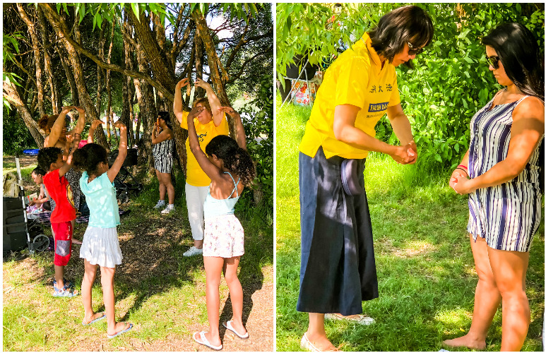 ![]() 图1:学员在摊位竖起“法轮大法好”的横幅、摆上真相展板信息台并演示法轮功的五套功法,将法轮功的美好带给当地的社区民众。 |
