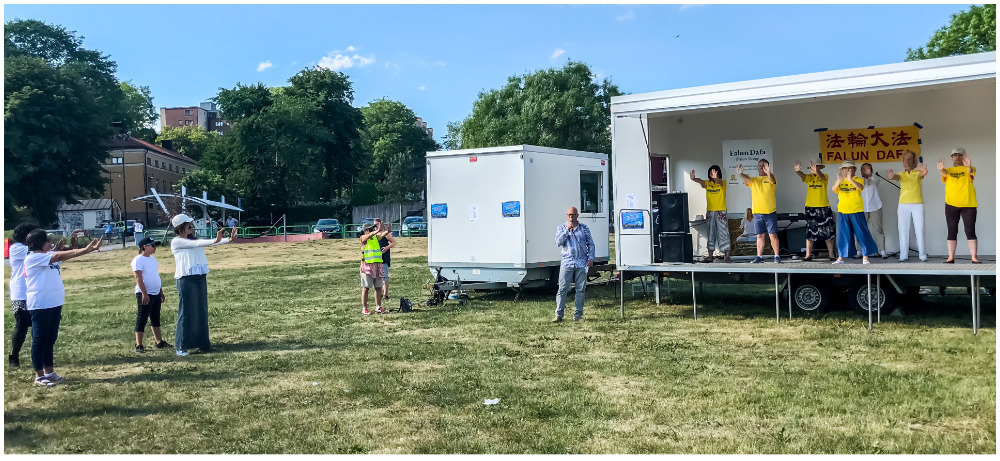 二零一八年六月二日,瑞典斯德哥尔摩南部的Botkyrka社区,在靠近湖边地铁站Fittja的大草坪上,举办一个盛大的夏日露天庆典活动。法轮功学员受该活动主办方负责人的邀请,在当天的活动现场设立了一个摊位,竖起“法轮大法好”的横幅、摆上真相展板、信息台并在庆典活动现场的舞台上演示法轮功的五套功法,将法轮功的美好带给当地的社区民众。