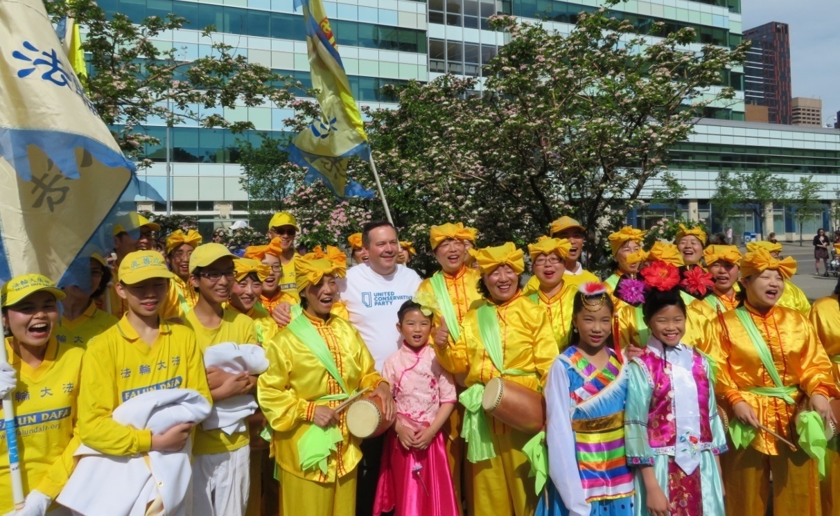 亚伯塔省联合保守党领袖、前国会议员杰森·康尼(Jason Kenney)先生在游行结束后,特地前来与法轮功学员合影,并带领法轮功学员高呼“法轮大法好”。