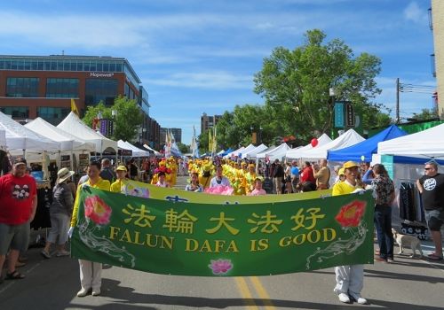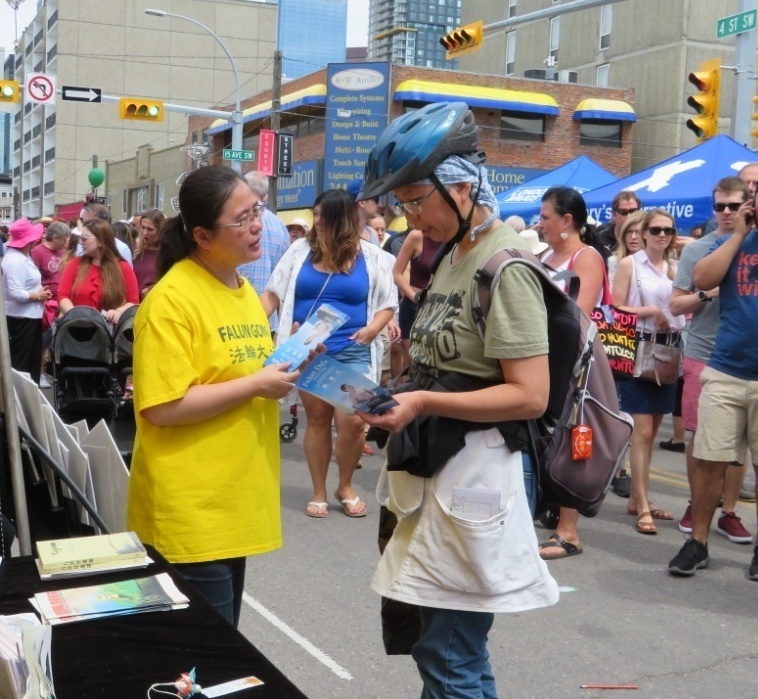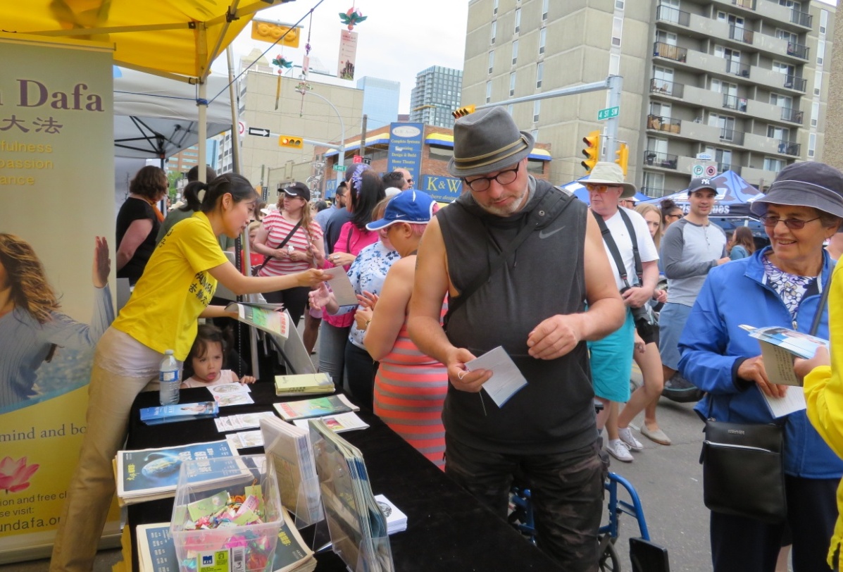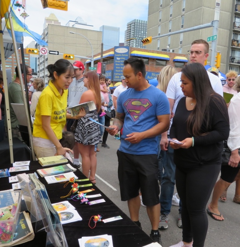法轮功学员每年都参加这一节日的庆祝,他们灿烂的笑容、亮丽的服装、铿锵的鼓点,给开幕游行增添了亮色。游行后,在展位上,法轮功学员进行了功法演示、分发传单、给民众赠送真相资料,并为来自大陆的华人办理退出中共党团队的“三:退.”服务。