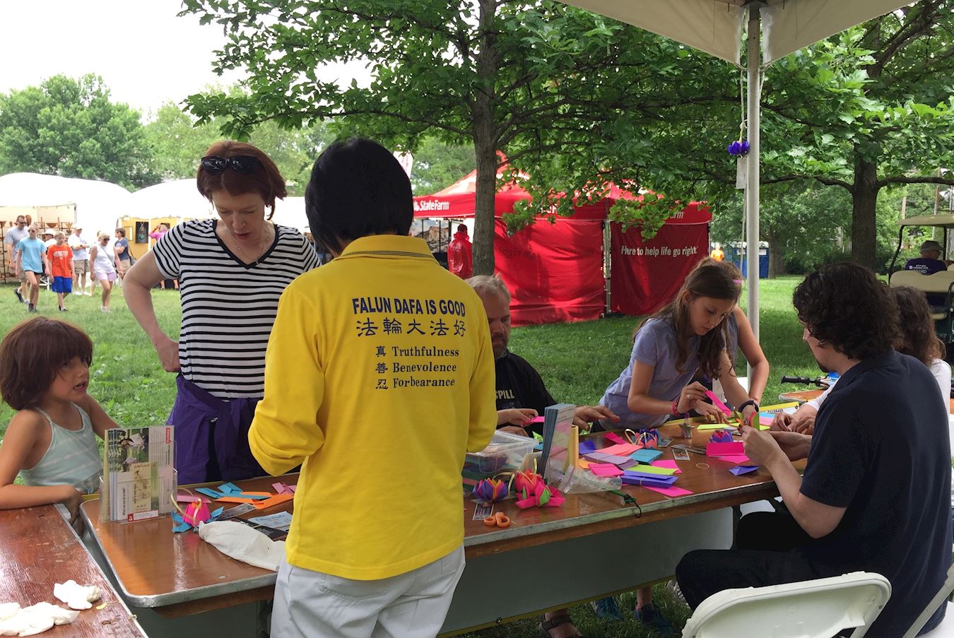 在韦伯斯特艺术节上,学员们教授孩子制作纸莲花,很多孩子非常感兴趣,挤在展位前学习。在一旁等待的家长们则聆听学员介绍法轮功的功法特点和“真善忍”原则,许多家长都表示认同,说自己正需要这样的功法,也需要在生活中更多地遵循“真善忍”原则。