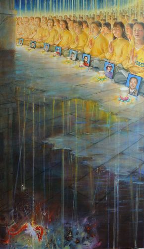 规格:画布宽32 ¼ 英寸,高55 英寸说明:在中共对法轮功的迫害中,没有人知道到底有多少法轮功学员被迫害致死。世界各地的法轮功学员常在所在地的中国领事馆前举行烛光守夜,悼念被迫害致死的同修。画的上半部展现法轮功学员发正念的场景,下半部分的水洼折射出另外空间对应的景象。