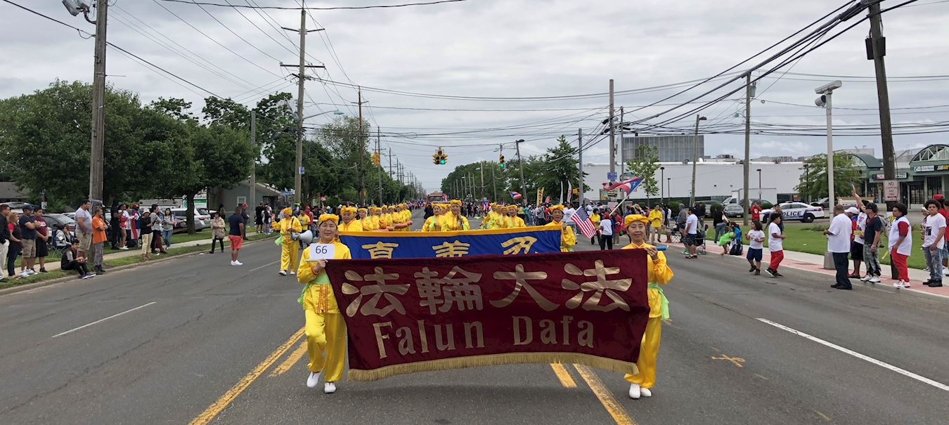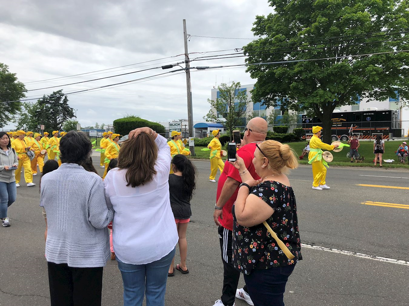今年,纽约法轮大法腰鼓队第二次参加本游行。腰鼓队身着金色的炼功服,金光闪闪,敲打着金粉色的腰鼓,成为所有游行队伍中唯一耀眼的华人团体。沿途观众热情地拍照,欢呼着并向队伍用中文高喊“谢谢你们”、“你好吗”等。
