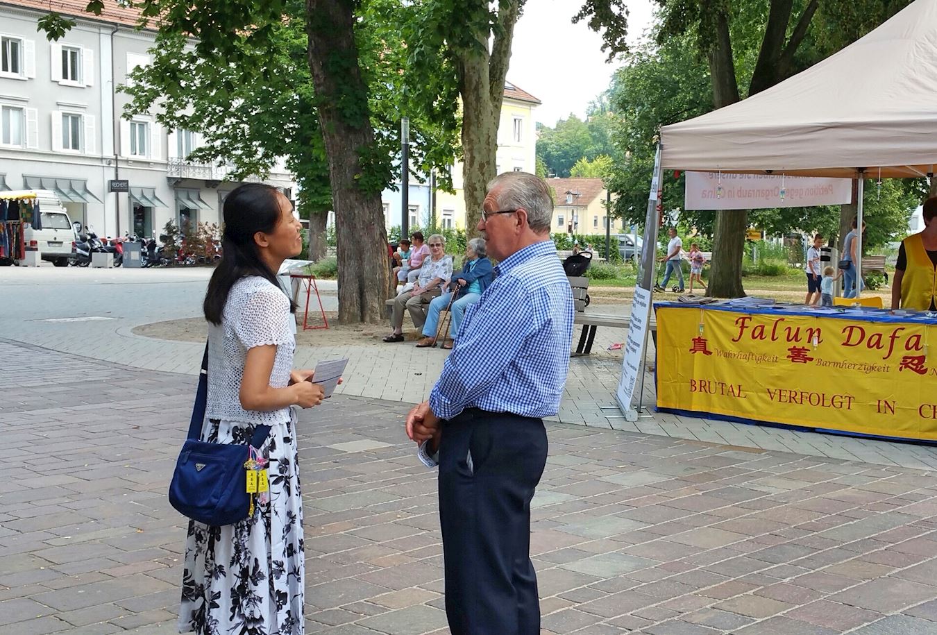 德国老先生贝恩德(Bernd)看完展板,找法轮功学员攀谈。他说:我在媒体上看到过相关报导。当今社会已经变得如此不可思议,人的道德败坏到如此可怕的地步了。你们能在这里做这些事情真是太好了。