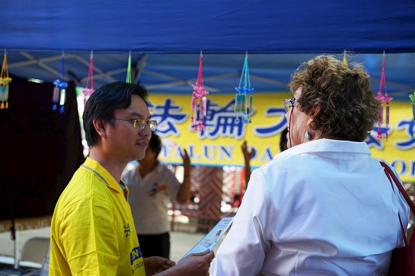 一位华人女士看到朋友拿到法轮功学员做的莲花,专程来到介绍法轮大法的展位,想为两个孙子各请一朵莲花回家。她认真听完学员讲述法轮大法在中国大陆遭受迫害的真相后,接过莲花,并轻声念了两遍“法轮大法好”和“真善忍”。