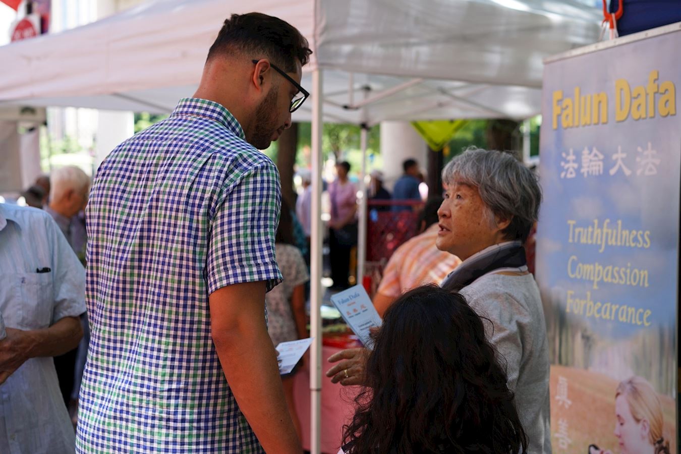 法轮大法学员在功法展示之外的时间循环播放着《普度》与《济世》音乐,有一位西人男士驻足,静静聆听,并感慨这音乐真美好。在与他交谈中,学员发现他对于中国古典音乐很有兴趣,在讲清真相之余还向他推荐了下半年将来到波士顿的神韵交响乐。