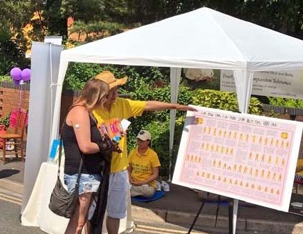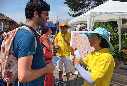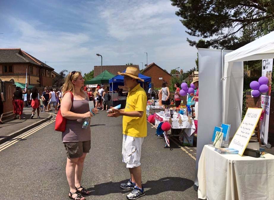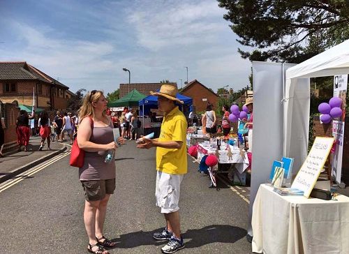 一位年过七十岁的英国女士,在经过法轮功的摊位时,接过了学员递上的传单,欣喜地说:“哦,我在家里的邮箱里收到过这个传单,我很想参加,今天经过这里真是提醒了我。”在听到学员细心讲解与功法使人内心升华的感受后,这位女士跟学员说:“我好想成为和你们一样的人。”后来这位女士成为了法轮功学员的朋友。