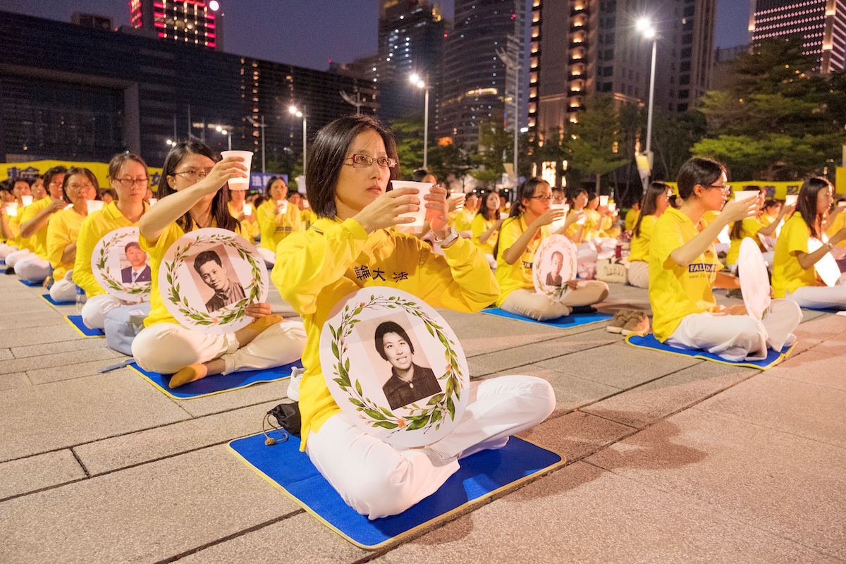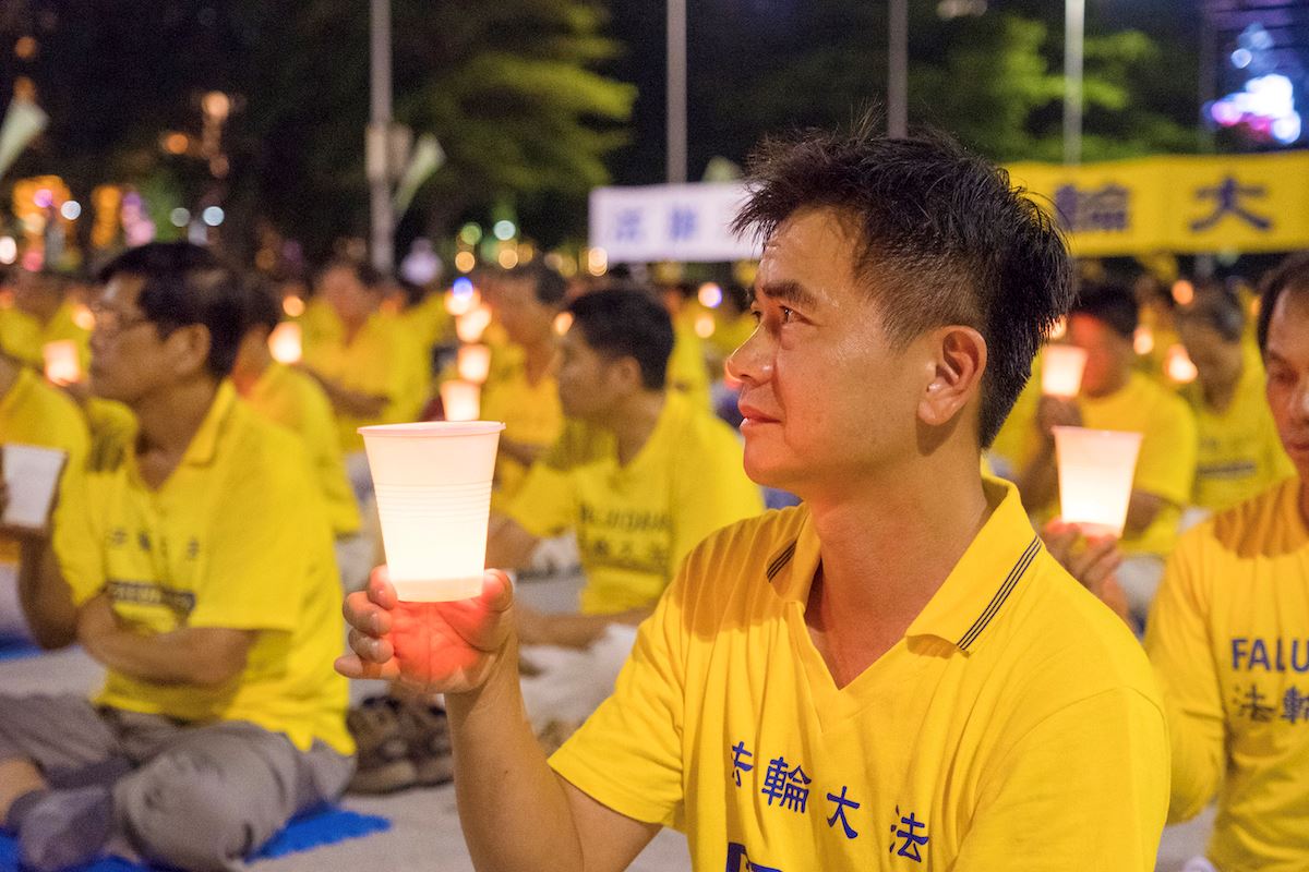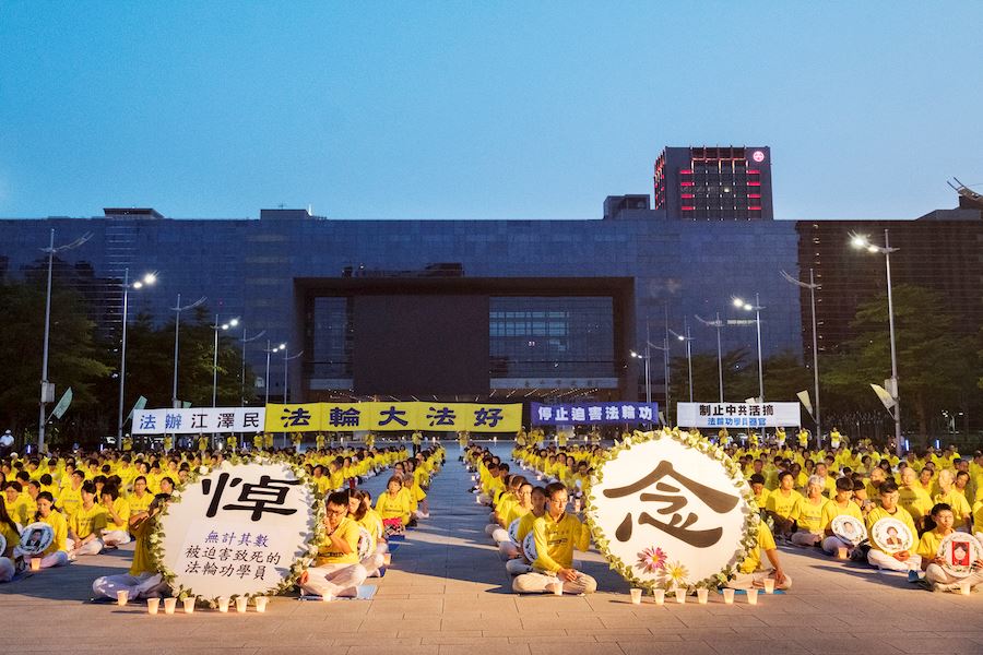 广场前的台湾大道上车水马龙,他们向民众演示五套功法、派送资料、以影片揭露中共对法轮功残酷迫害的事实。过往的行人、车辆纷纷放慢速度关注,人们停下来拍照、观看。也有来自大陆的民众,靠过来询问了解,并做了三:退.。当夜幕低垂时,用点点的烛光及歌声悼念在这场迫害中失去生命的法轮功学员。