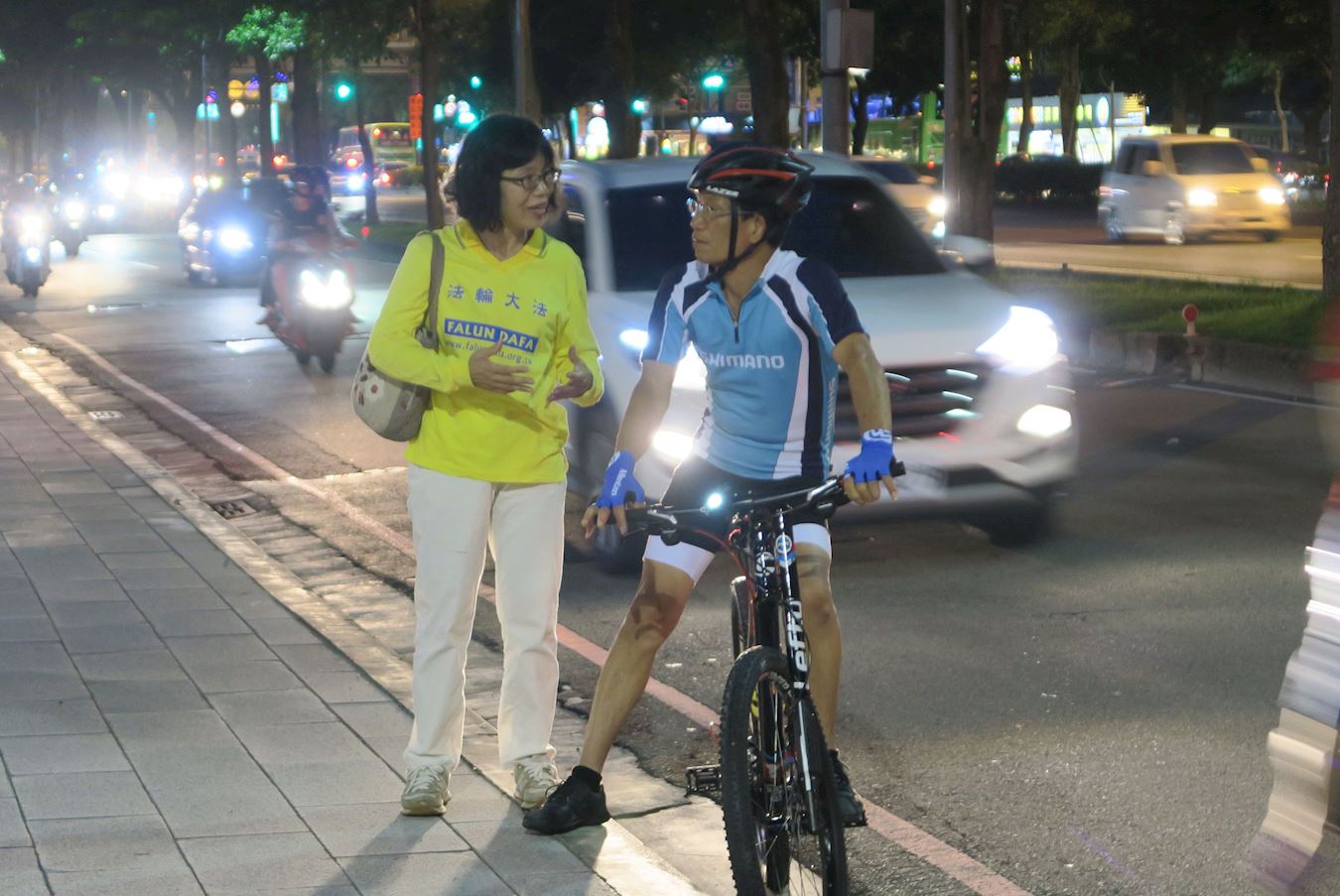 ![]() 图4:法轮功学员正在向一位停下脚步关注的自行车骑士解说活动意义。 |