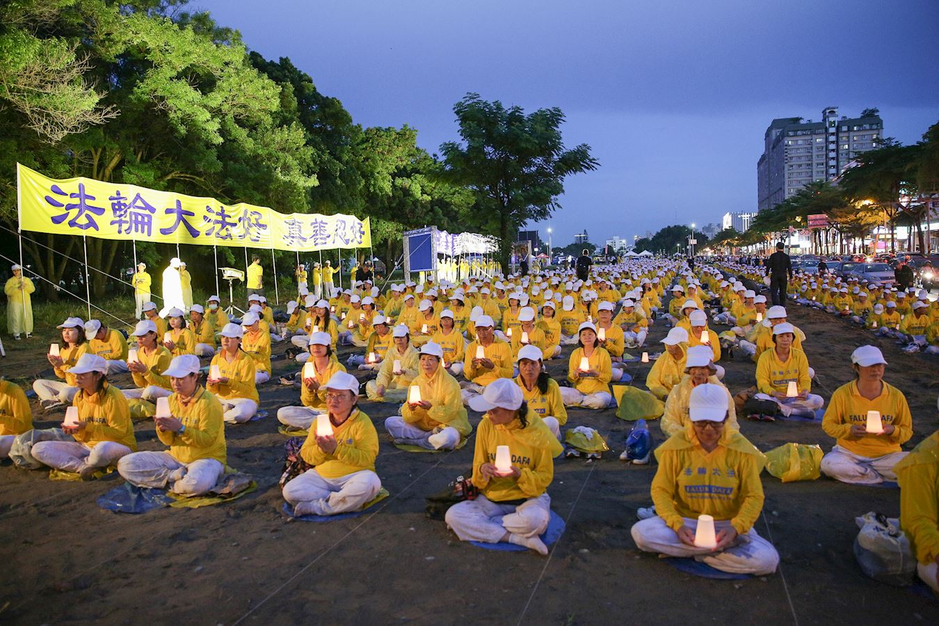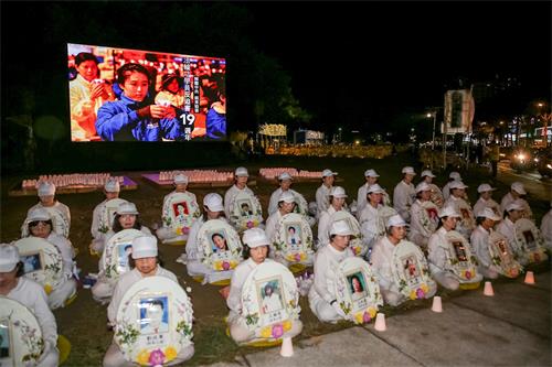 ![]() 图1~2:南台湾逾千名法轮功学员在在台南周末影城附近人潮往来密集的平实公园周边,举办反迫害十九周年烛光悼念活动。 |