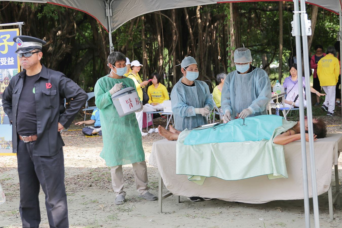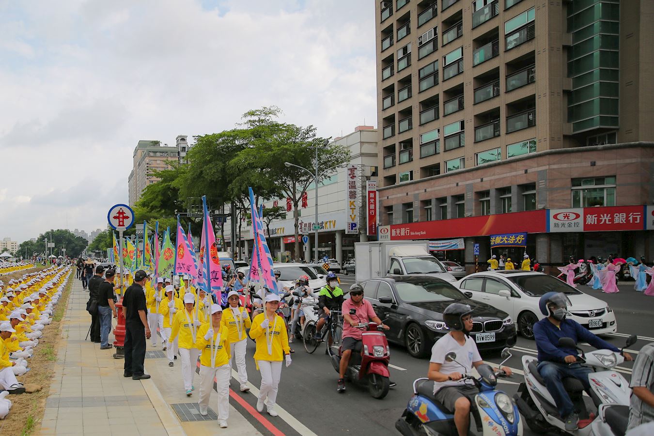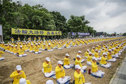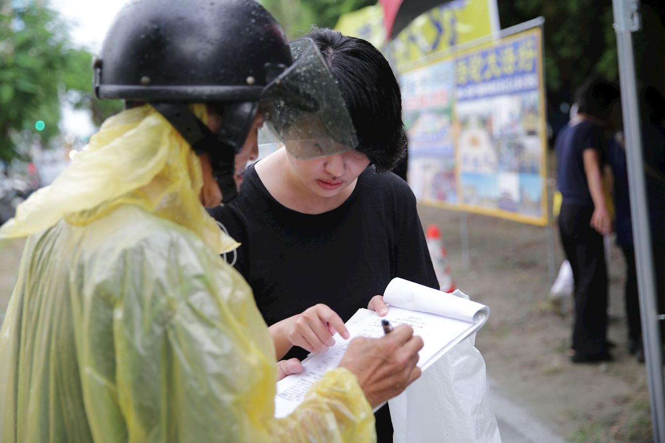 台南的午后突然倾盆大雨,来自南台湾澎湖、嘉义、台南、高雄、屏东、台东等六县市一千多位法轮功学员,风雨中举办了功法长城、小型巡回游行、真相图片和酷刑展、“烛光悼念会”等活动,呼唤慈悲、唤醒善良。法轮功学员安静祥和的炼功场面和附近其他造势团体的喧哗形成鲜明对比,吸引不少来往民众驻足关注和明白真相。