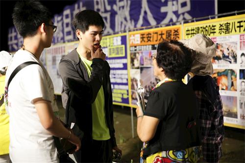 ![]() 图11:来自台南西港的市民郭先生夫妇第一次遇到法轮功,沿着真相展板一片片非常仔细的阅读着,并呼吁公安明智抉择。 |