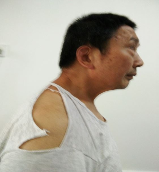 车子到了终点站,乘客们都下车了,我刚好下车,见一辆公安车停在旁边,这时,从车里下来两三个穿便服的中年男子,与其他人一起将我连推带拉,想把我塞进公安车,其中一个女人由于用力过猛,将我穿的灰色T恤衫(右肩膀处)的衣服拉烂(见下图),又听见一个人说:“叫人把他看住。”不一会儿,又来了一辆公安车,把我直接绑架到了上次遭迫害的北固乡派出所。