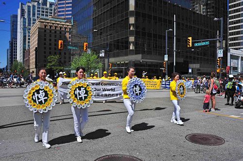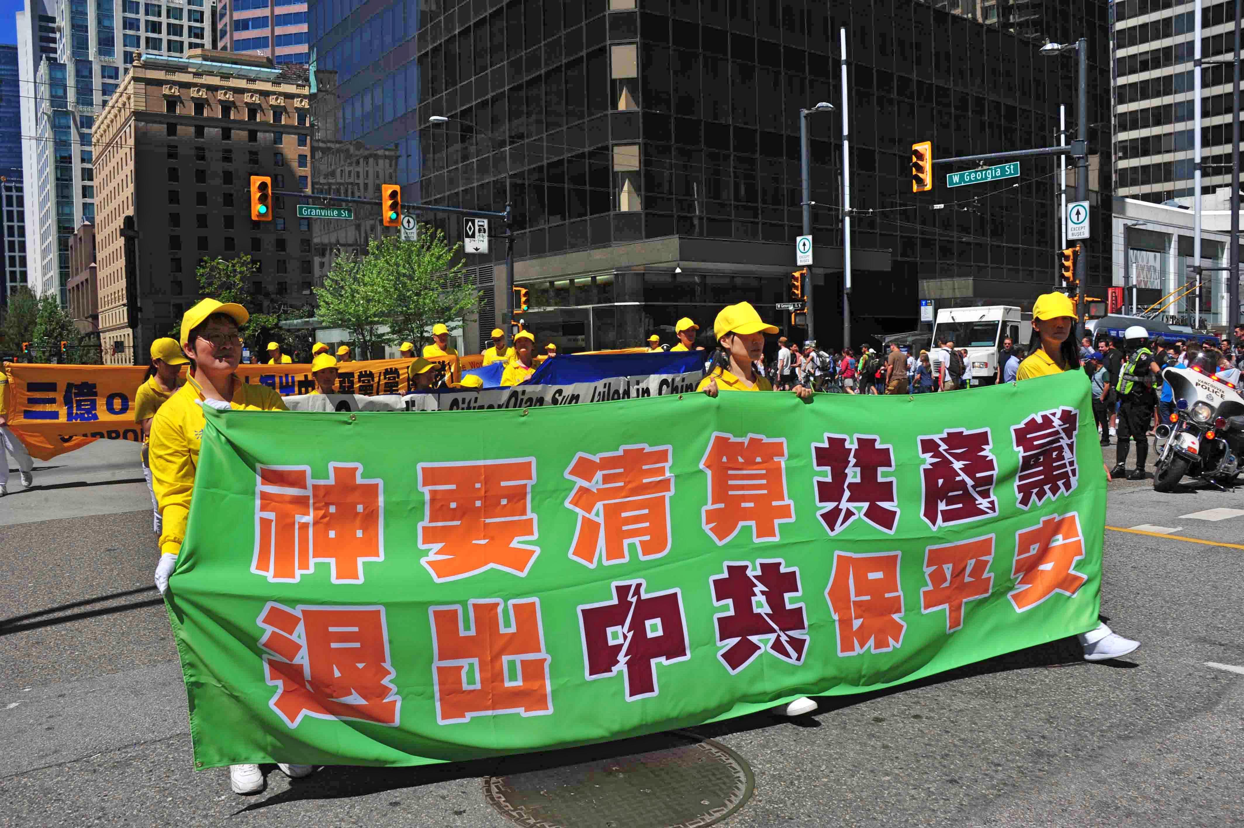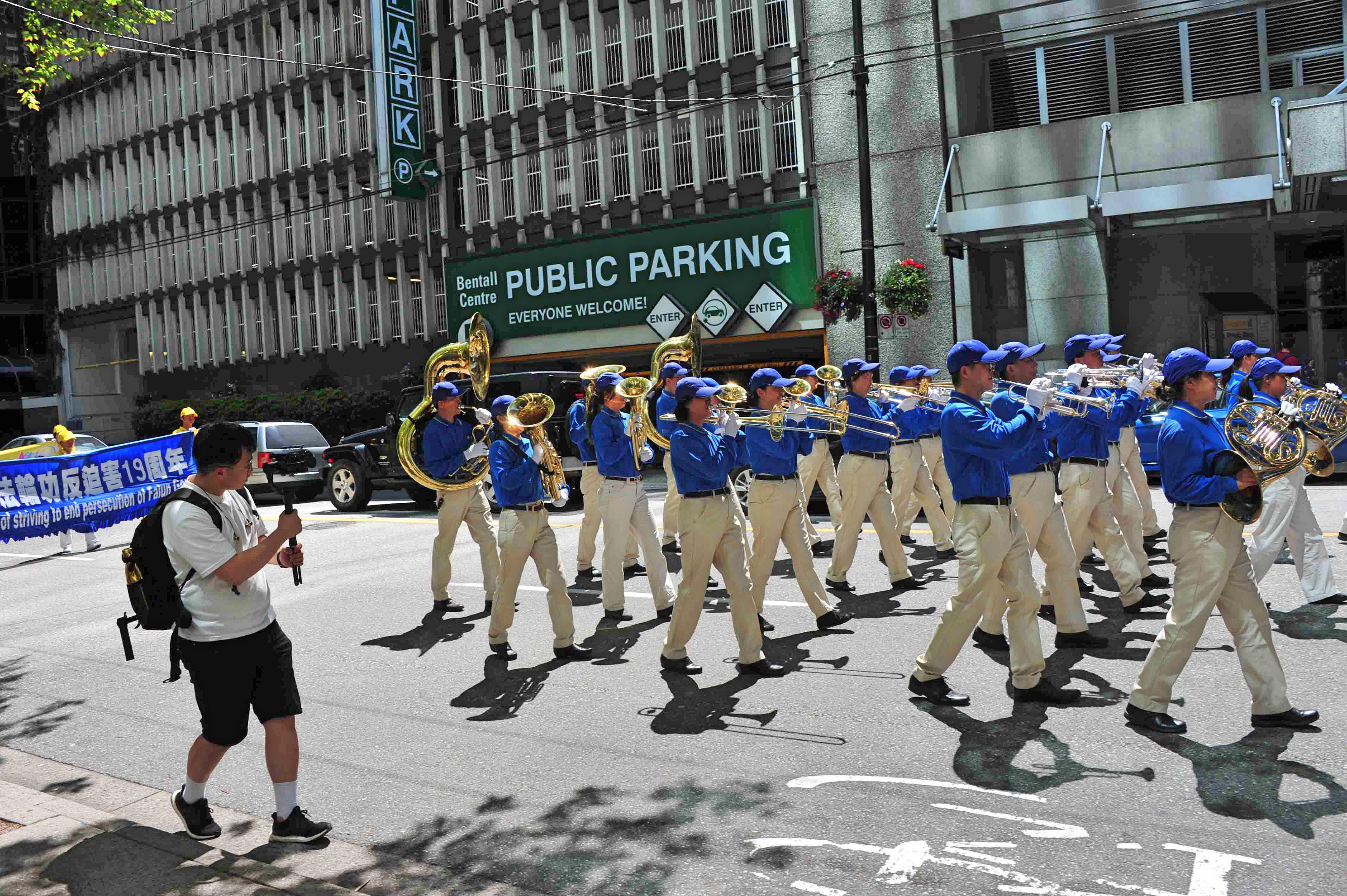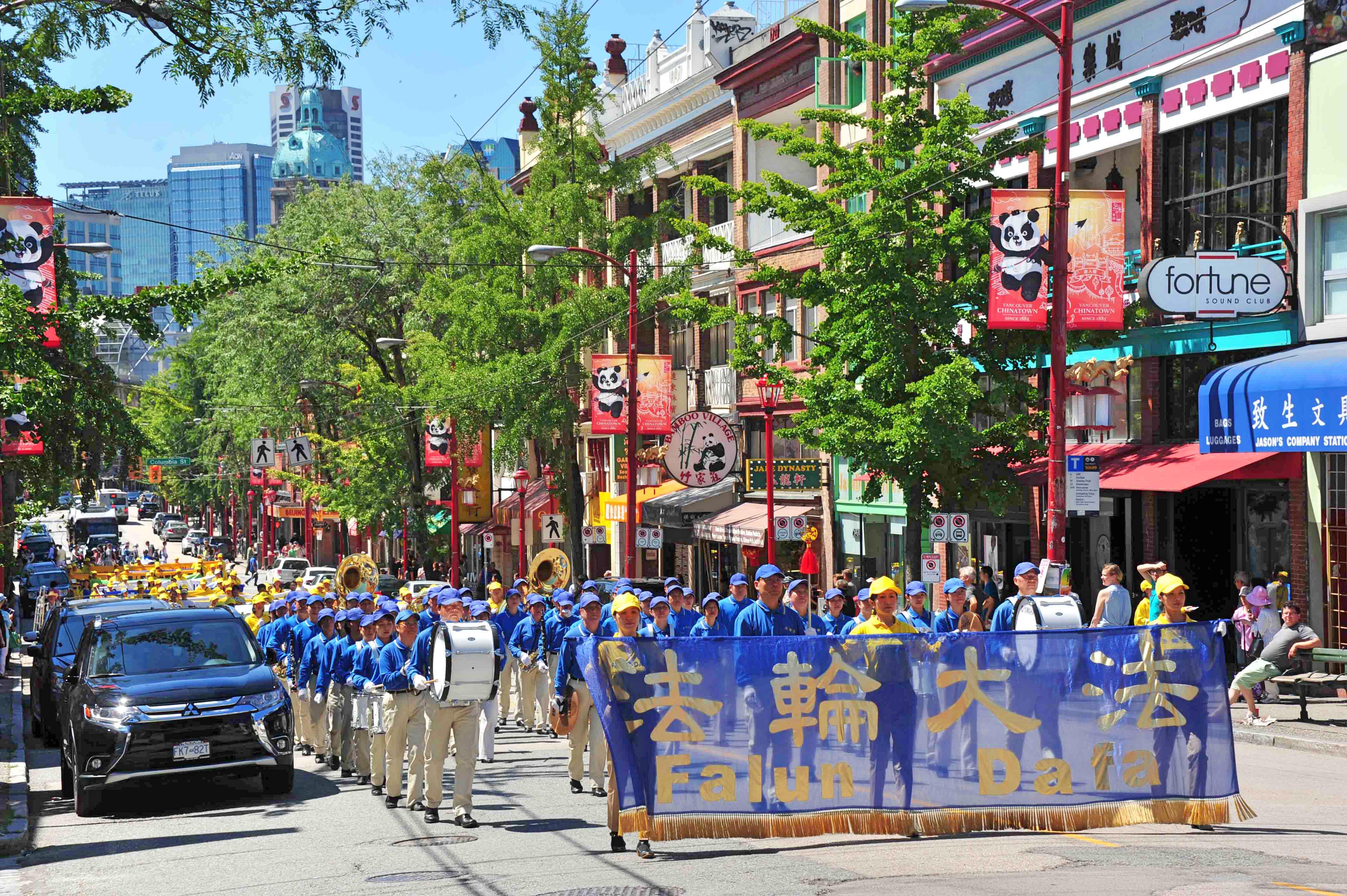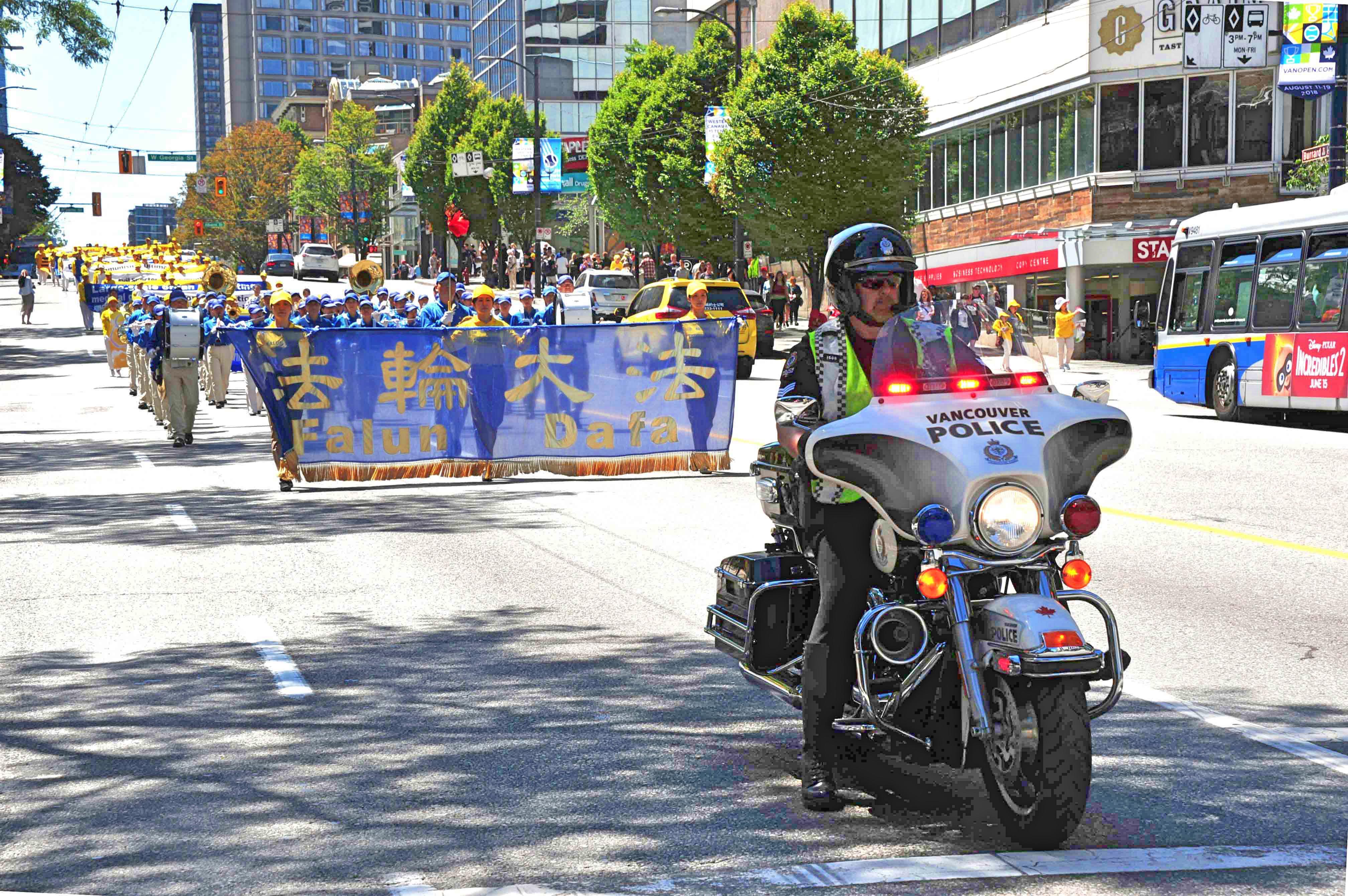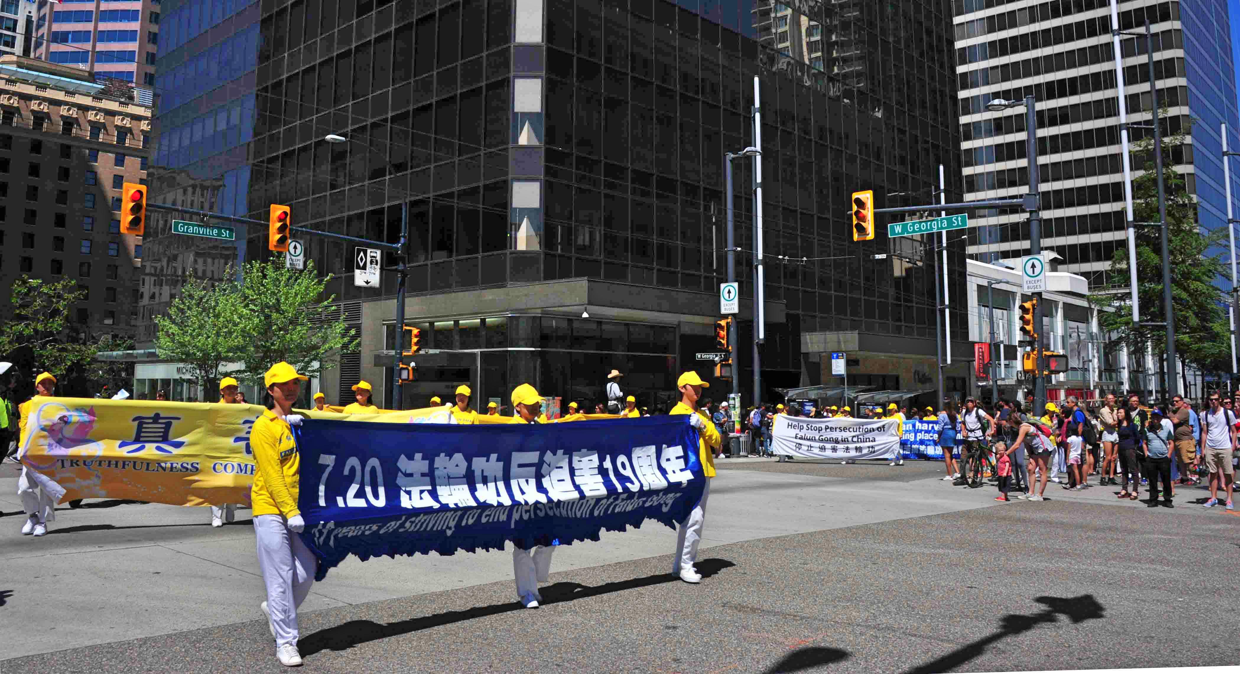 游行队伍在加拿大皇家骑警的引领下,以天国乐团开头,法轮功学员们手拉“停止迫害法轮功”,“法轮大法好”,“世界需要真善忍”,“做中华儿女不做马列子孙”,“共产主义的终极目的是毁灭人类”等横幅,途经市中心的主干道固兰湖大街(Granvile),博拉德大街(Burrad),乔治亚大街(George),最后进入中国城,在中国城内环形后结束游行,历时一个多小时。
