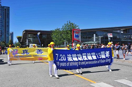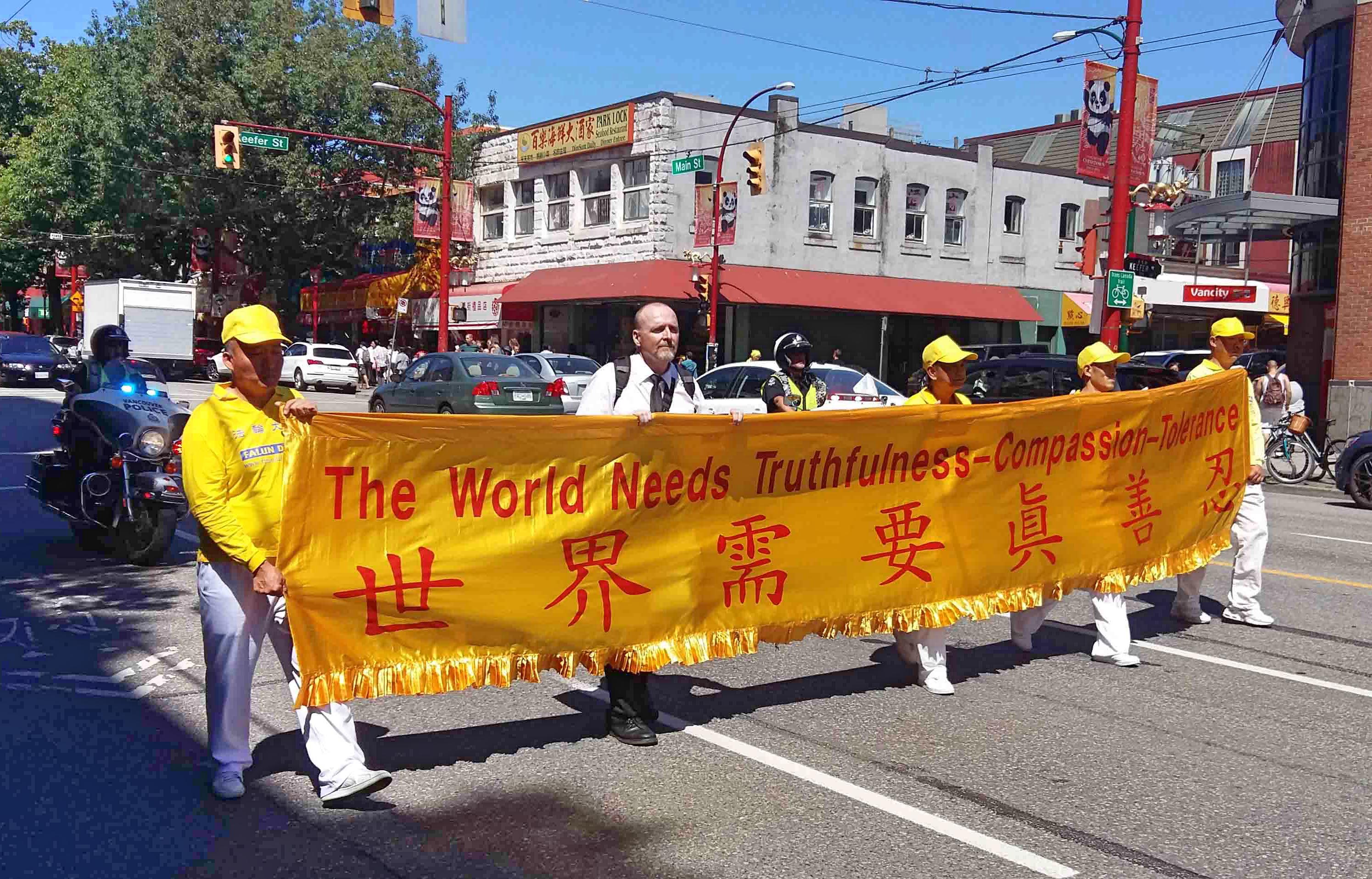 【明慧网二零一八年七月十六日】(明慧记者张然温哥华报道)在反十九周年来临之际,二零一八年七月十四日中午,加拿大温哥华法轮功学员在温哥华市中心繁华地区举办游行。很多观看的市民表示:法轮功学员做的好,游行很吸引人们注意,使人们关注中共对法轮功学员的迫害。