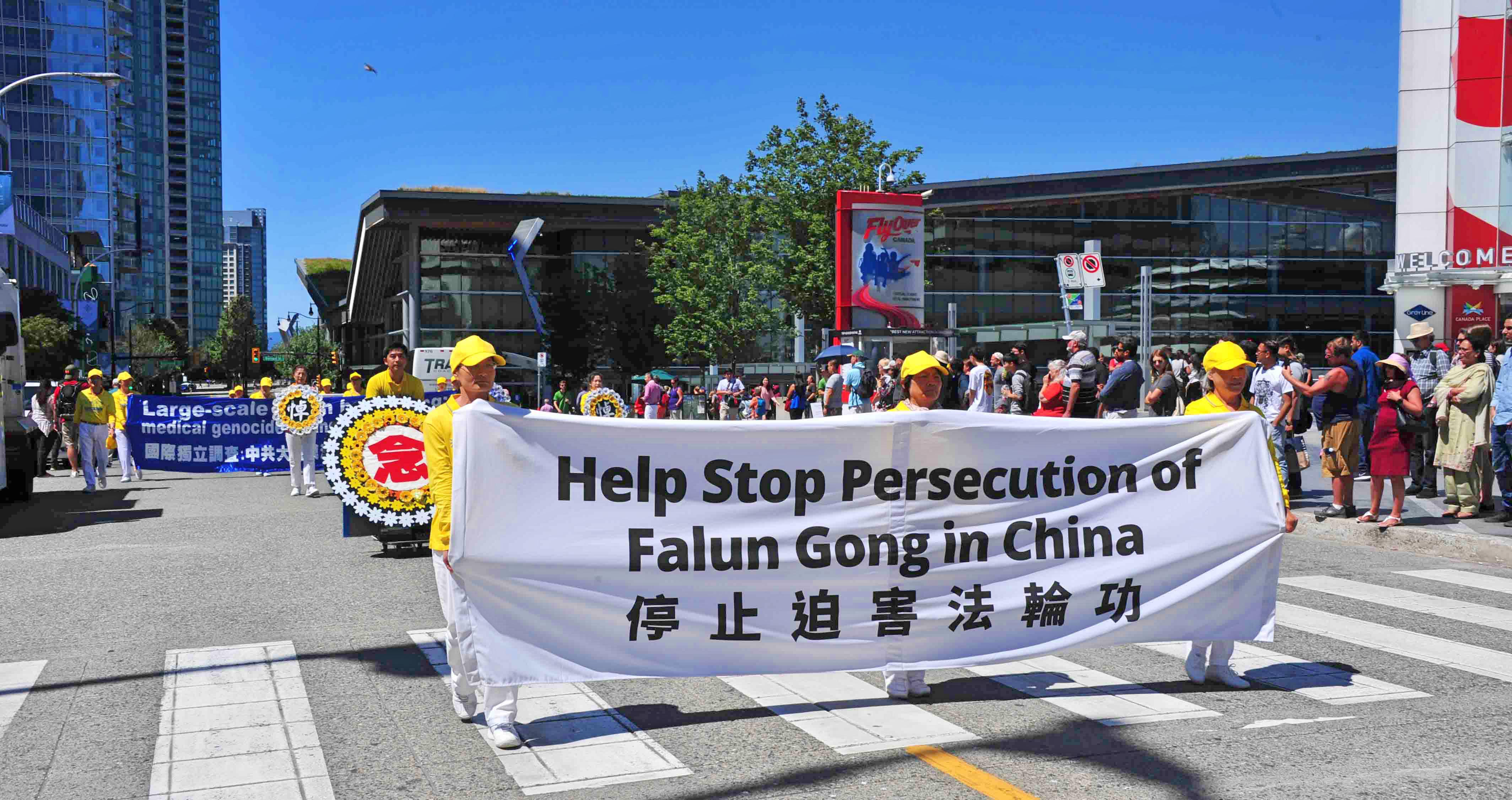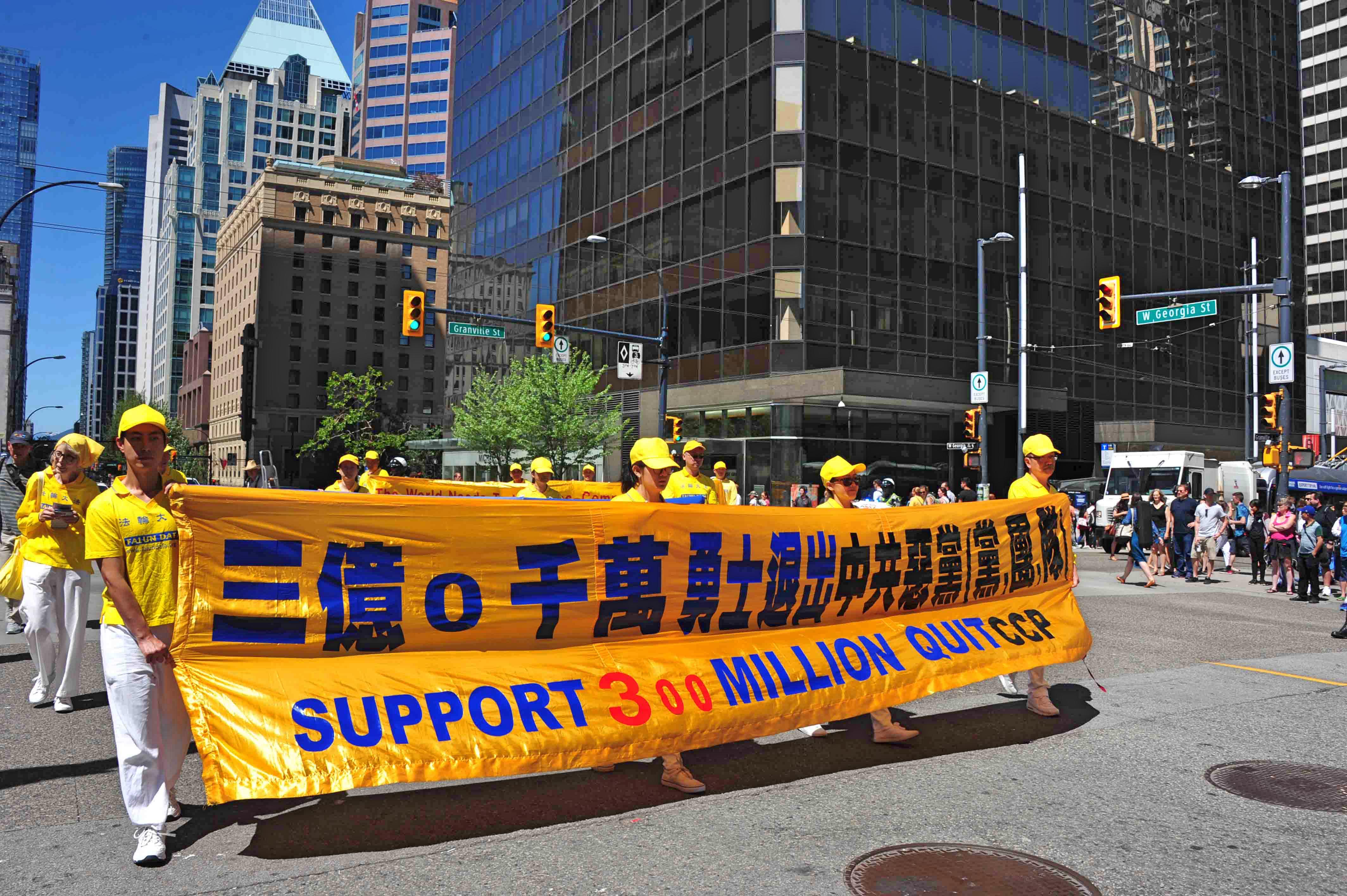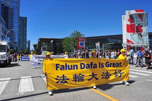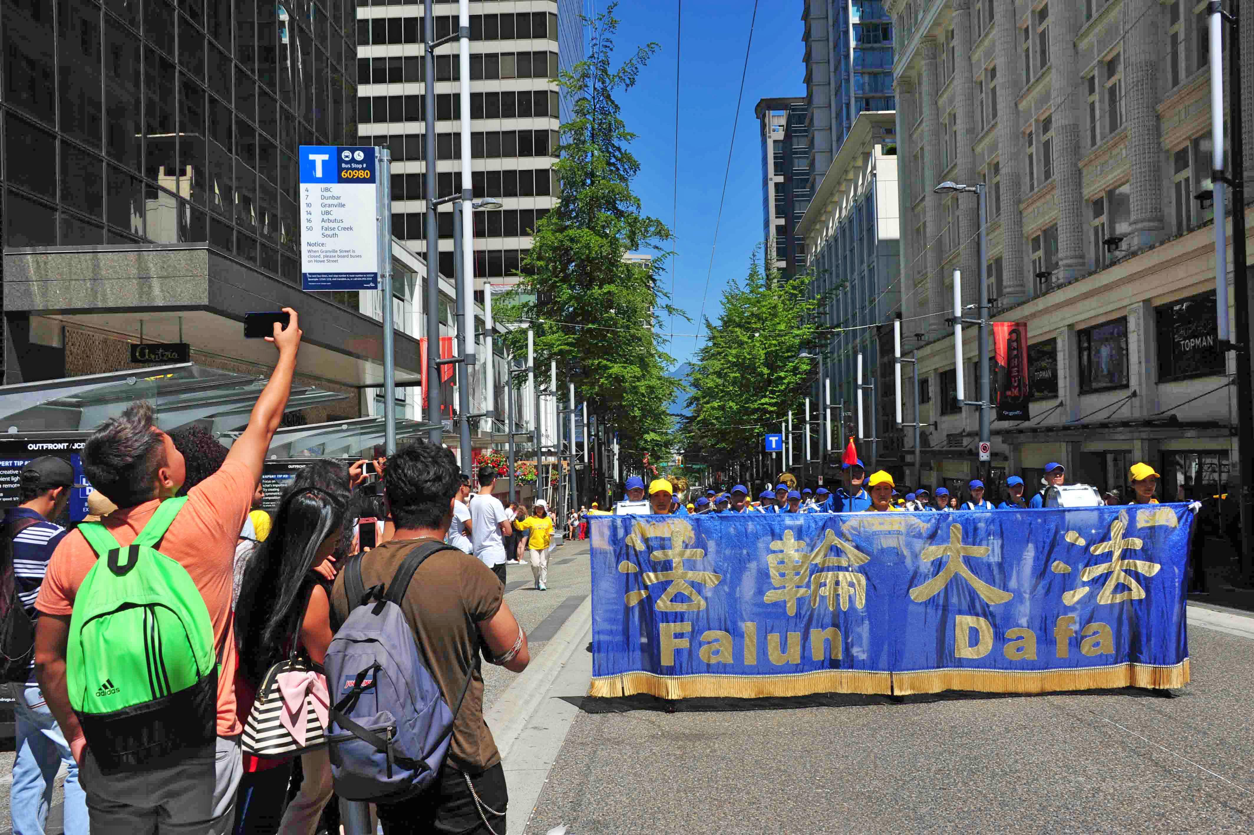 温哥华法轮功学员游行队伍途经温哥华市中心著名旅游景点,温哥华冬季奥运会火炬景点和温哥华五帆酒店,很多游客兴奋地在路边纷纷拍摄法轮功学员的游行队伍,其中包括很多华人游客也兴奋地用手机录像,还有华人跟随法轮功学员游行队伍走过几个街区。在中国城很多华人纷纷拍摄法轮功学员游行队伍并微笑着拿了法轮功真相资料。