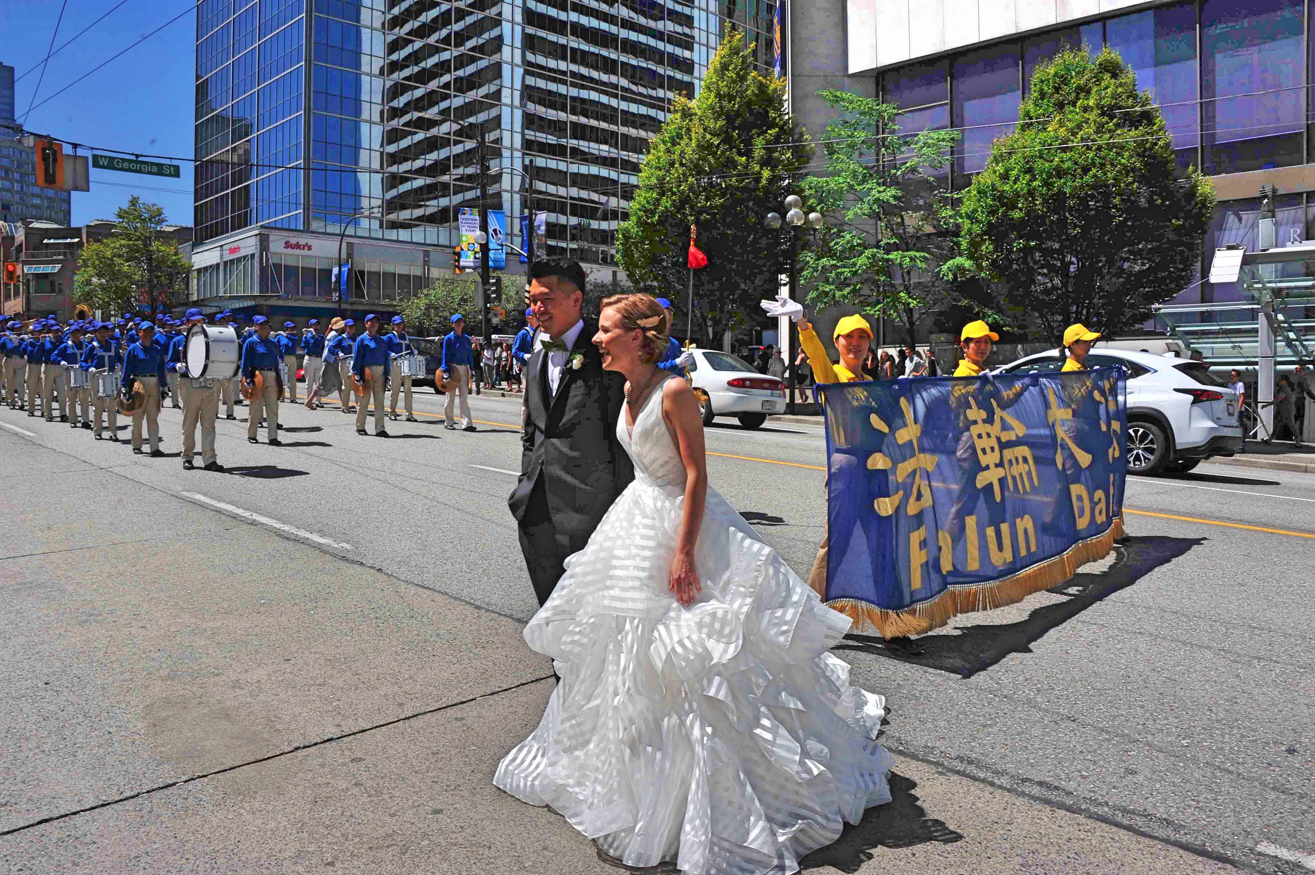 当天天气十分晴朗,温哥华市中心道路两边很多行人。温哥华法轮功学员的游行队伍从罗宾逊广场出发刚拐入Burrad大街正好遇到一对新人正在举行婚礼,新郎和新娘立即在亲朋好友们的欢呼声中与游行的法轮功学员天国乐团合影留念。