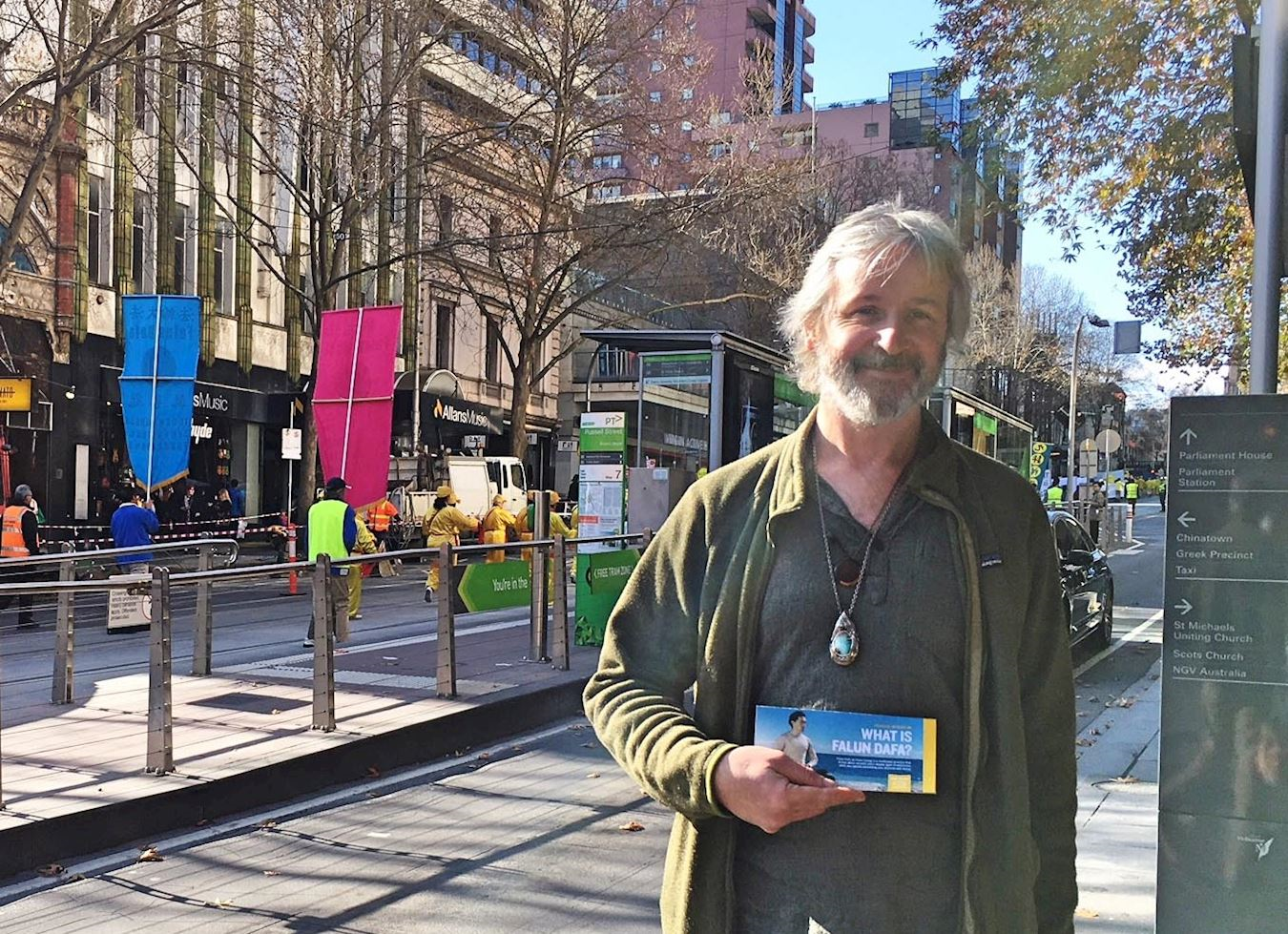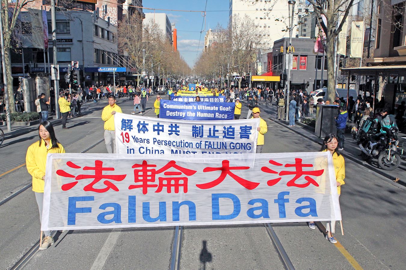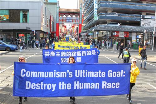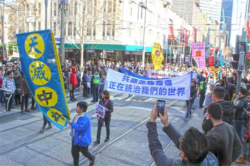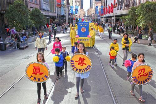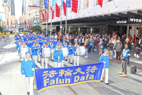 二零一八年七月十四日周六,温暖晴朗、阳光和煦,法轮功反迫害十九周年之际,部份墨尔本法轮功学员在市中心举行了游行和集会。其中,封路大游行穿越最繁华的商业步行街和唐人街,震撼人心。