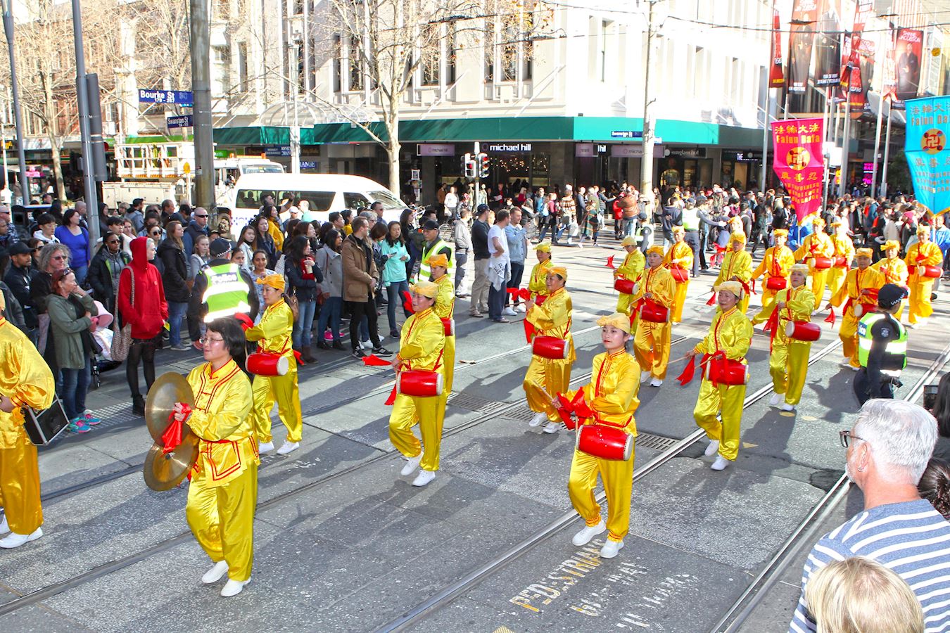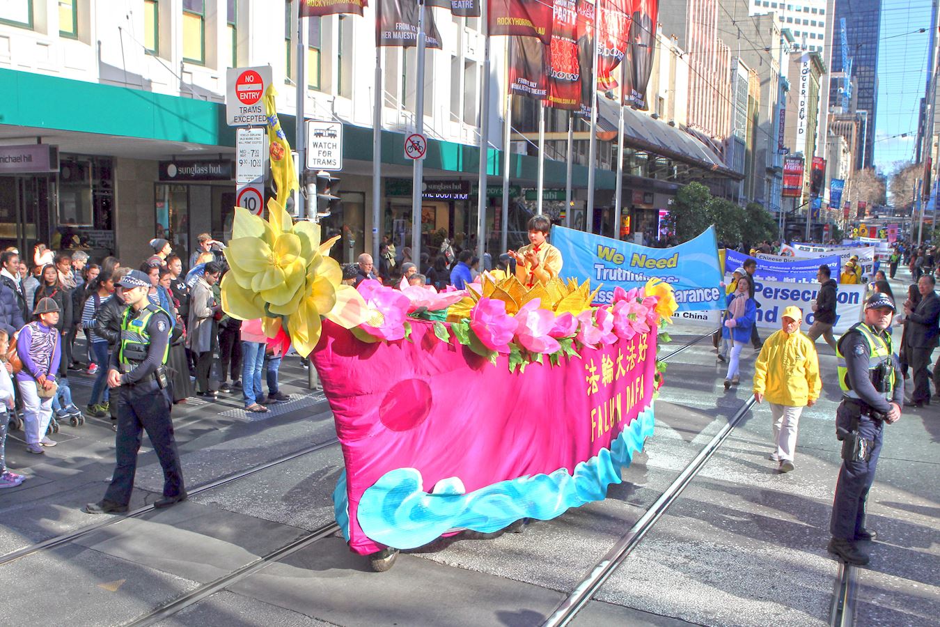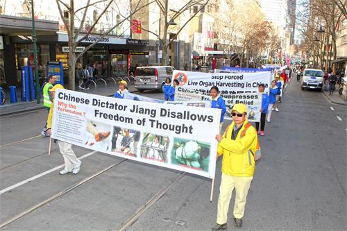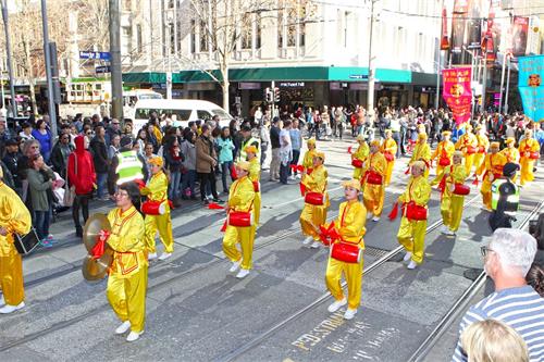 这是冬季的墨尔本一个难得的周末好天气,时值学校假期,市中心游人如织,处处可见结伴出游的家庭和年轻人。随着天国乐团奏响雄浑的鼓乐,游行队伍于十二点三十分从风景如画的维多利亚女王公园出发,警察开道护航,一路浩浩荡荡。