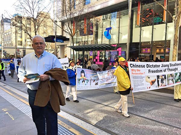 另一位墨尔本市民玛丽(Mary)则在路边聚精会神地观看游行队伍很久,她说:“很高兴看到中国人能勇敢地站出来,向人们展示自己的信仰、捍卫自己的信仰,从来没看到过其它的亚洲团体这样做。”她觉得这样很了不起。