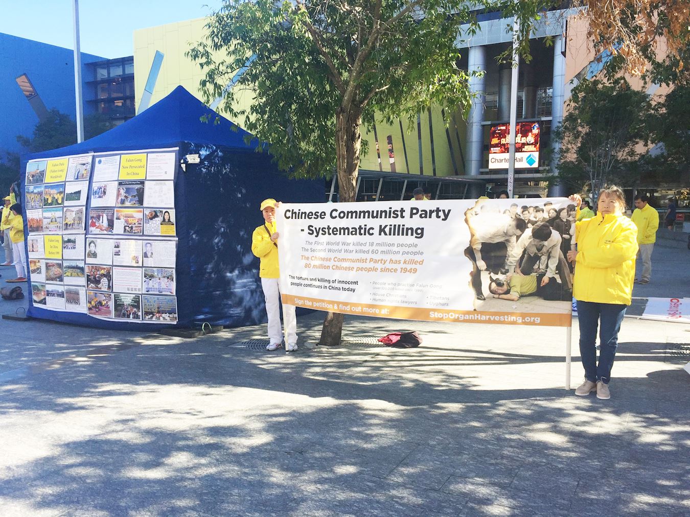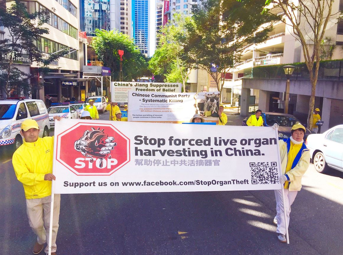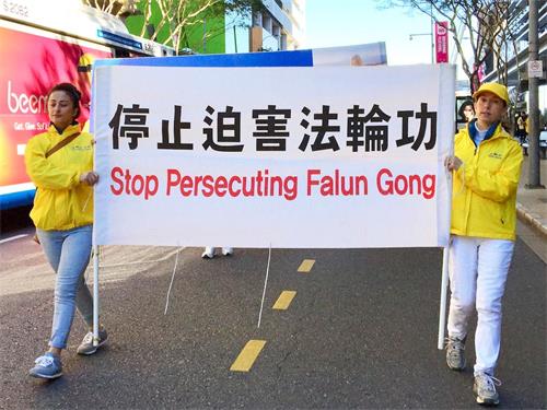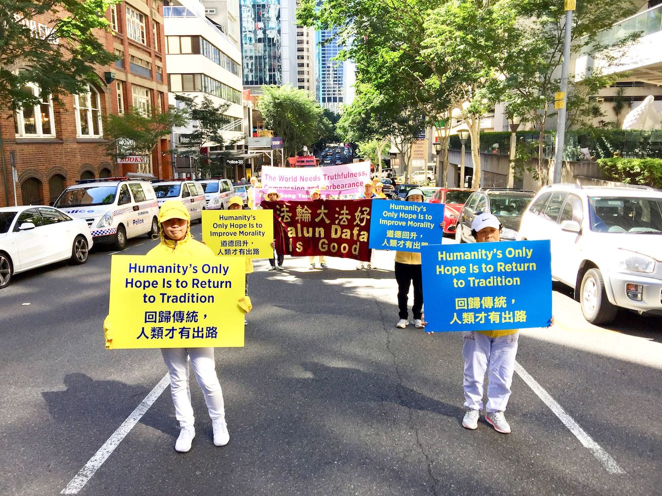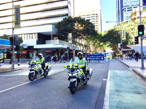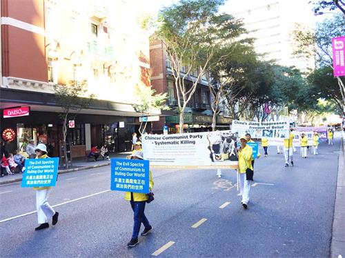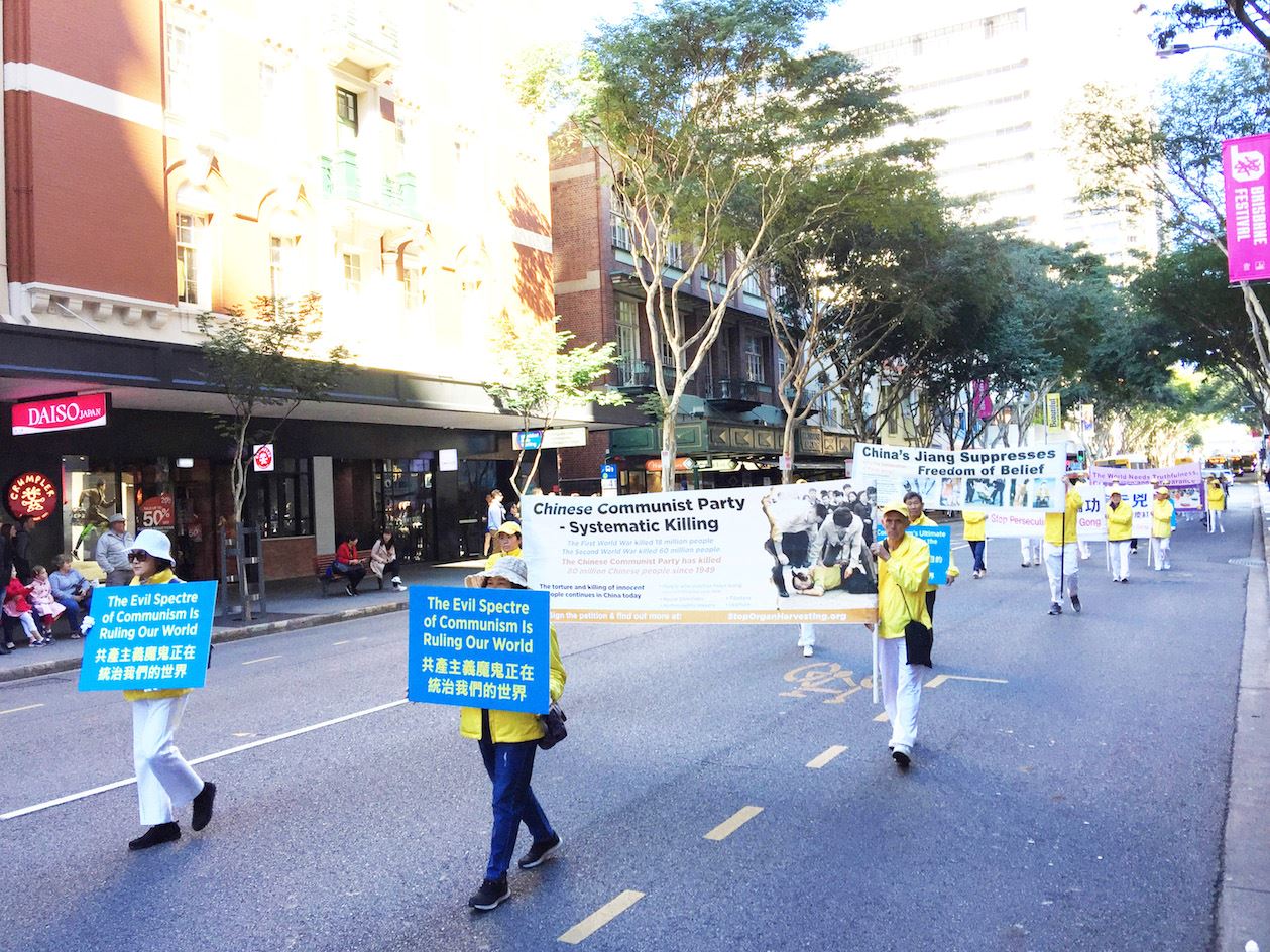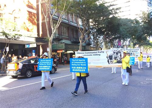 中午时分,近百名学员在警车的护卫下开始了街心游行。学员手持横幅,随着庄严的“普度”乐曲,在市中心的主要街道缓缓而行。横幅上的信息吸引着沿途民众。游行结束后,学员回到布里斯本广场,继续进行讲真相活动。