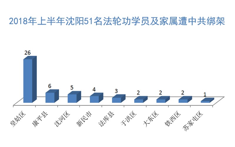 根据明慧网报道统计,二零一八年一至六月份,沈阳市共有五十一位法轮功学员及家属遭警察绑架迫害;其中四十九人遭当地警察绑架,迫害严重的皇姑区有二十六人遭绑架。