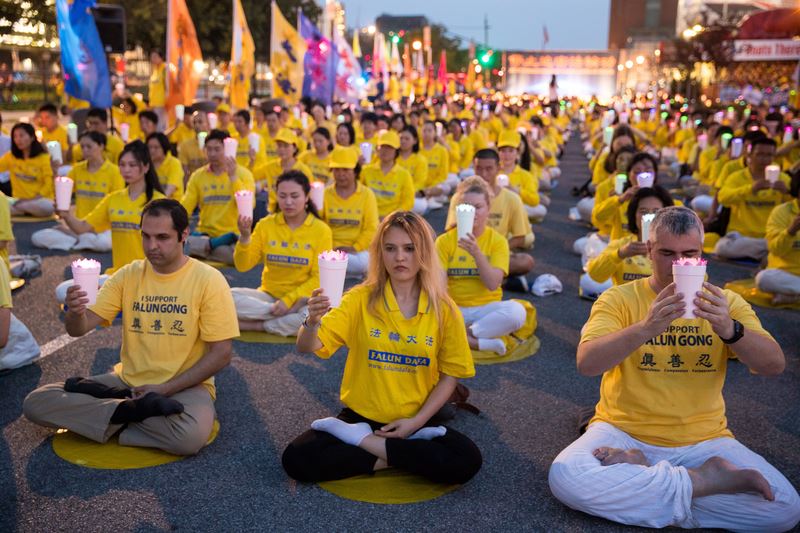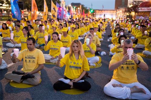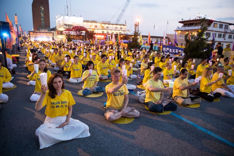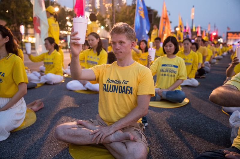 迎着夕阳的余晖,面对着十二大道上穿梭不断的车流和哈德逊河码头的游客,法轮功学员打出“停止迫害法轮功”、“全球公审江泽民”、“法轮大法好”的横幅。夜幕低垂之际,法轮功学员盘腿比邻而坐,点燃烛光,默默悼念为坚持真理而失去生命的法轮功学员。点点烛光,照亮黑夜,如法轮功学员的正信、慈悲与坚韧,给人类带来光明与希望。