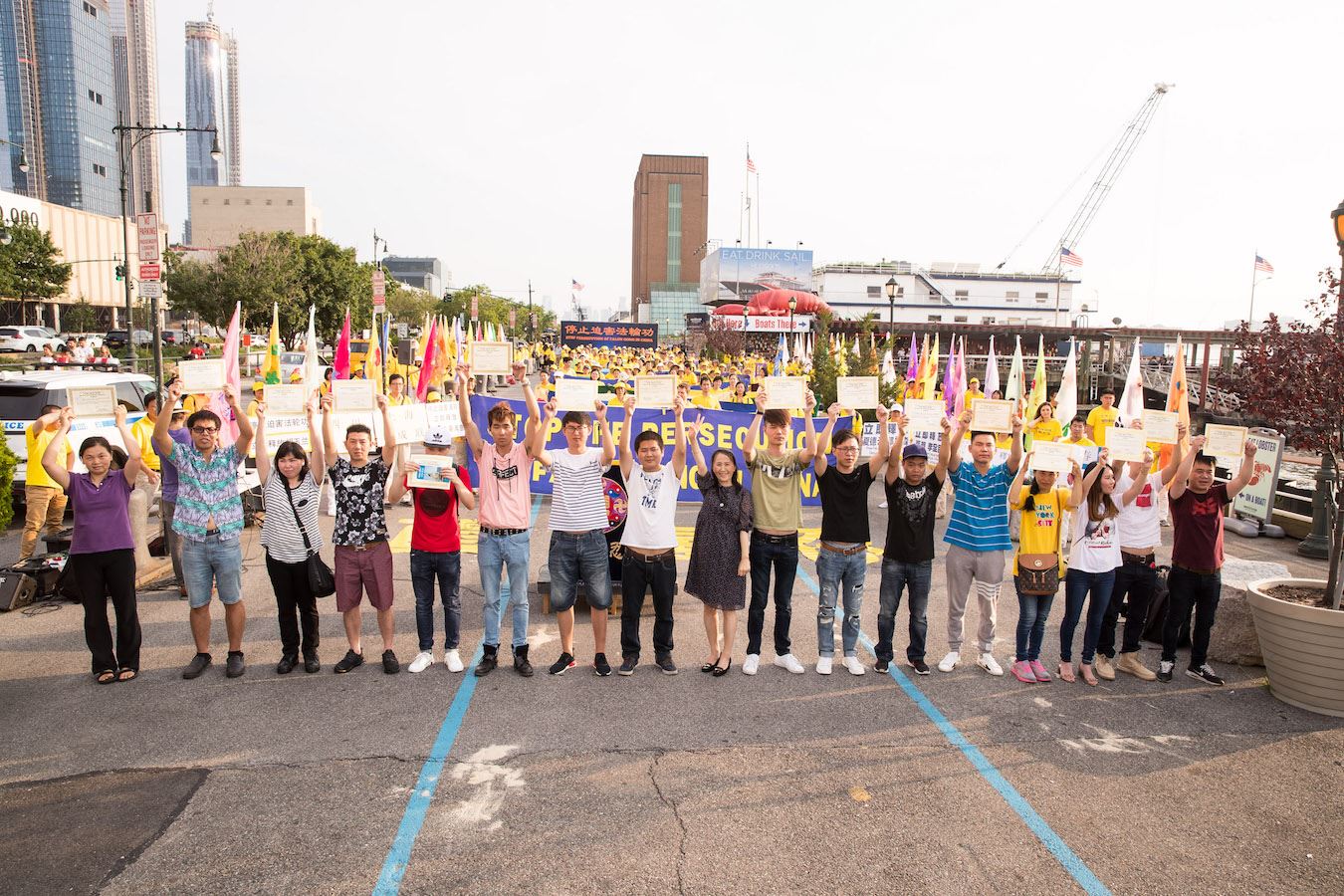 ![]() 图14:十七名华人在纽约法轮功学员7.20反迫害19周年集会上,现场公开退出中共的党、团、队。 |