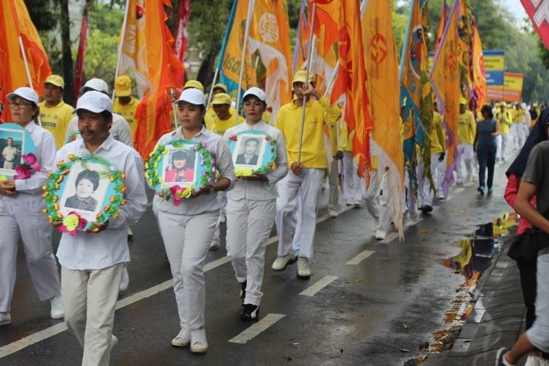 ![]() 图1:法轮功学员打出三种不同语言的“停止迫害法轮功”横幅 |