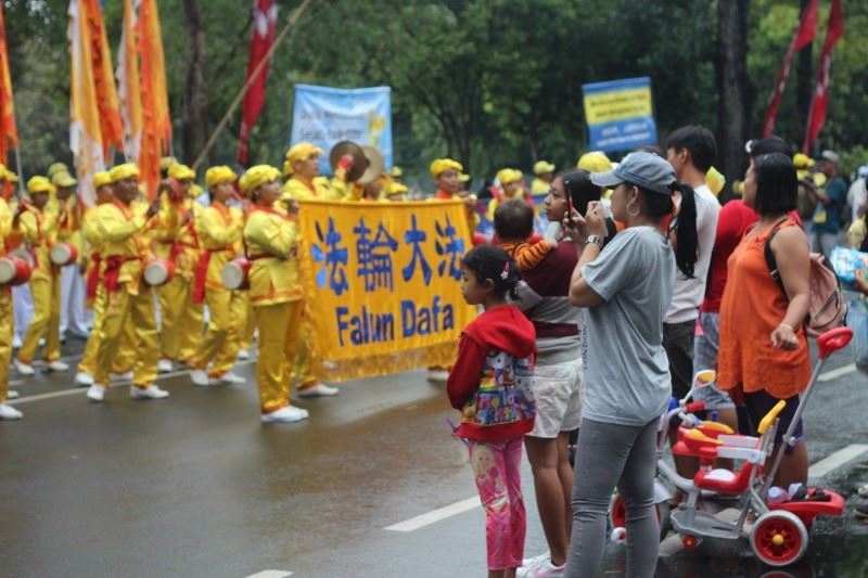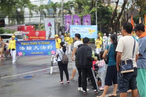 游行由腰鼓队领队,接着是真相横幅、悼念被迫害致死大陆同修的队伍等,吸引路人驻足观看,有些人竖起大拇指,赞扬法轮功的美好并支持法轮功学员的行动。