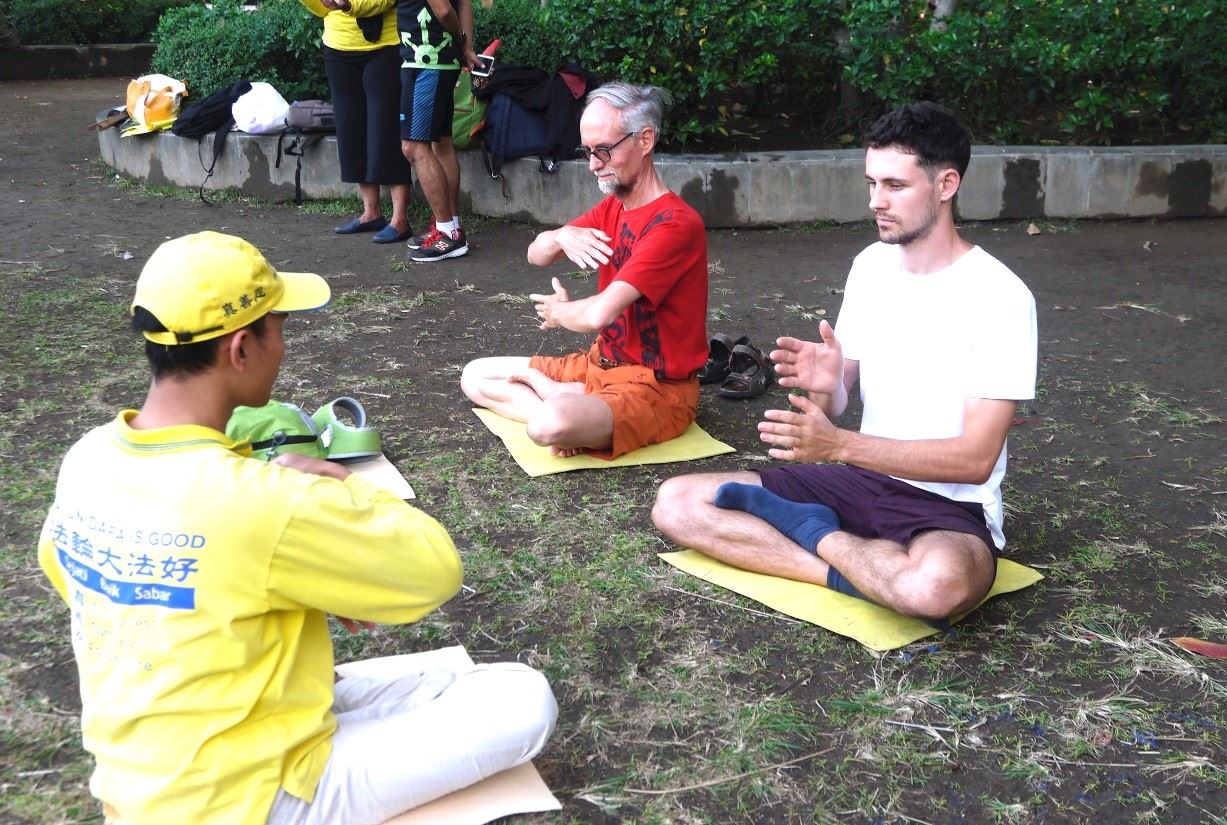 游行结束后,法轮功学员在傍晚时接着集体炼功。在炼功期间,有两位来自奥地利的游客看到法轮功祥和优美的功法,很开心地请了法轮功学员教他们炼功。