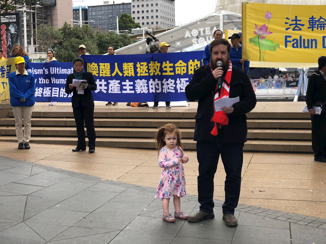 彼得·哈哥斯特(Peter Hugst )与儿子马修在法轮功学员的集会上驻足聆听很久,他在新西兰的新闻上知道法轮功被中共迫害,他一直以来都不喜欢共产党,对集会演讲人的观点非常赞同。他说,自己知道共产党是一个残酷的政党,但不知道有这么严重。他认为今天这样的活动非常好,他鼓励法轮功学员们要坚持下去。
