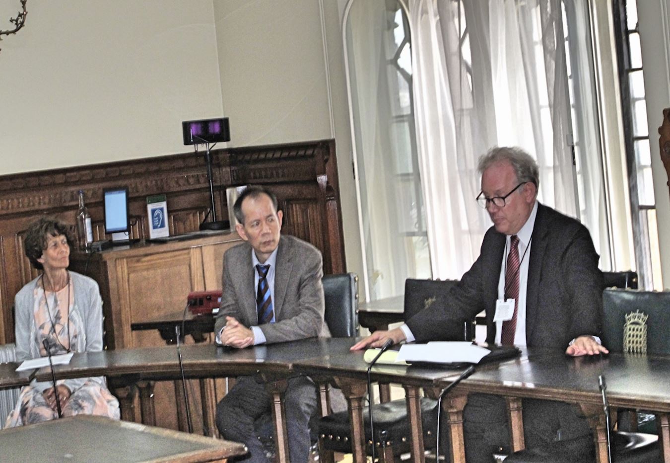 ![]() 图8:大卫·柯克汉姆(David Kirkham)博士(右)在英议会大厦“法轮功反迫害十九年”研讨会上发言 |