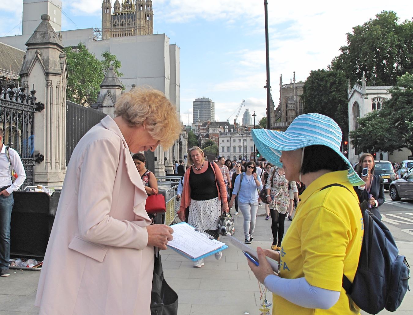 在持续十个小时的活动中,很多人接过法轮功真相传单、驻足听法轮功学员讲真相、签名支持法轮功学员反迫害,他们当中包括来自世界各地的游客,也有不少英国人,他们都表示希望为尽早结束迫害贡献一己之力。