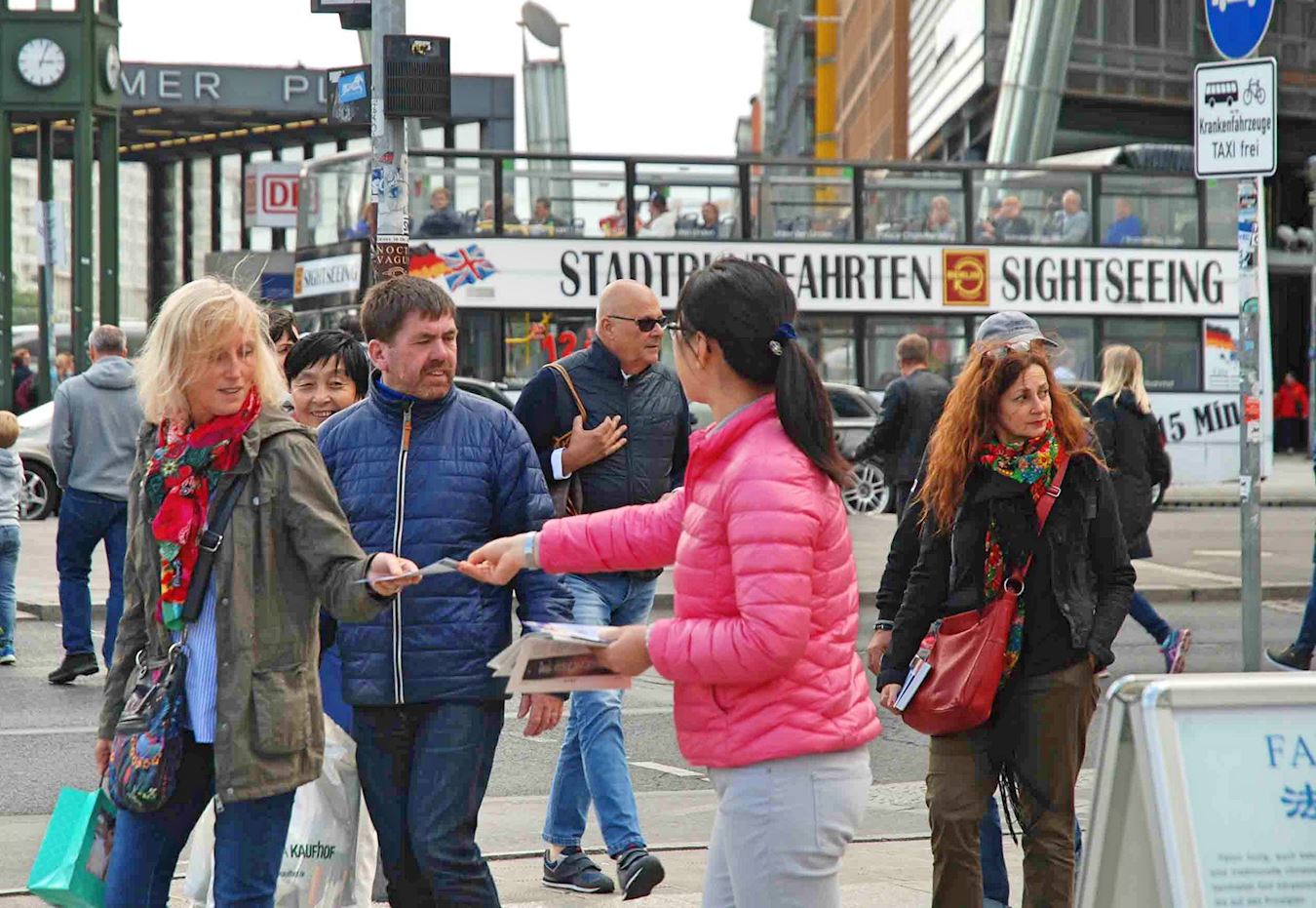 ![]() 图1~3:六月二十三日法轮功学员在柏林波兹坦广场( Potsdamer Platz) 上向游客讲真相。 |