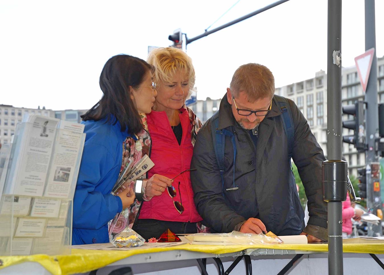 ![]() 图4:一对来自瑞典的游客在征签簿上签字支持反迫害 |