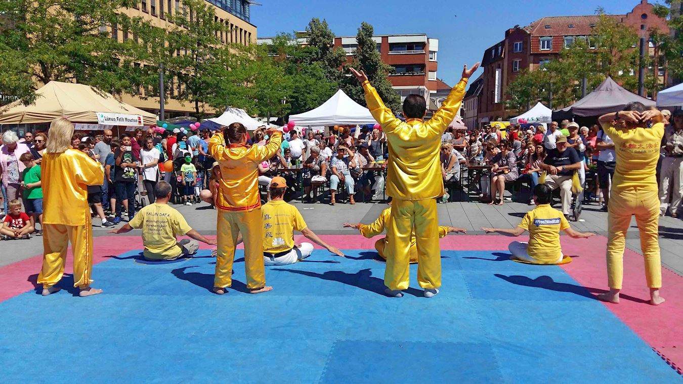 刘女士上周刚从美国华盛顿回到德国,在那里参加了万名法轮功集体炼功的活动。她住在绿嫩市五十公里外的城市,头一天她上下班加上路上时间大约十一个小时,很辛苦,听说绿嫩举办城市节,就来了。刘女士说:“我对这个城市很熟悉,很亲切,这里绿化的很好,十三年前(二零零五年),我和其他法轮功学员第一次把法轮功介绍给了这里的民众,我们还跳舞了,那也是文化节。”