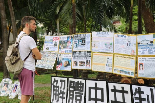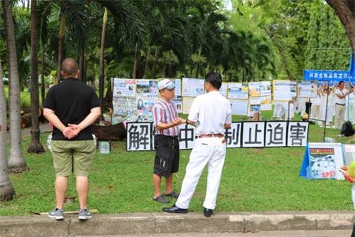 法轮功学员在现场展示功法,并用泰语向过往的游客介绍功法特点和法轮功无辜遭受中共迫害的真相,并揭露中共活摘法轮功学员器官的滔天罪行。不少游客驻足观看、了解详情。