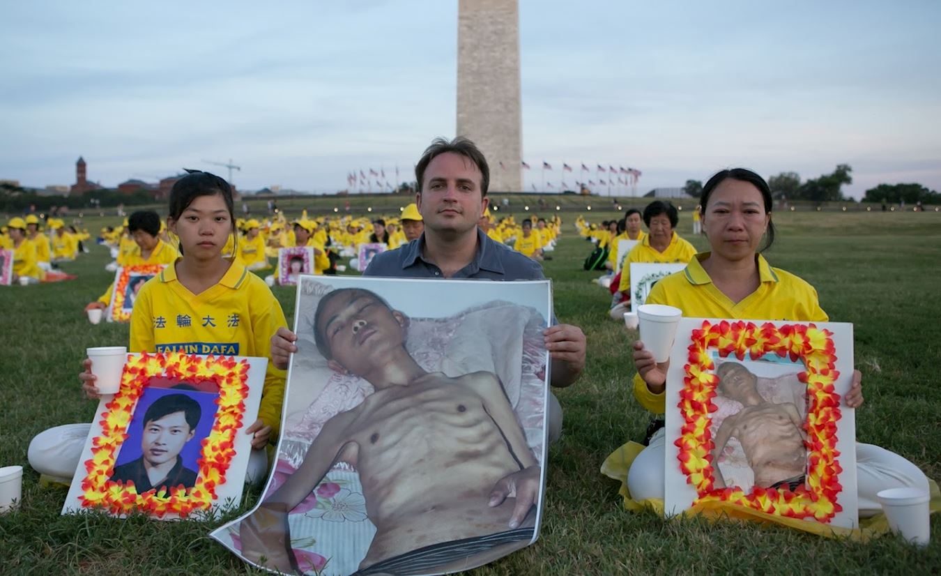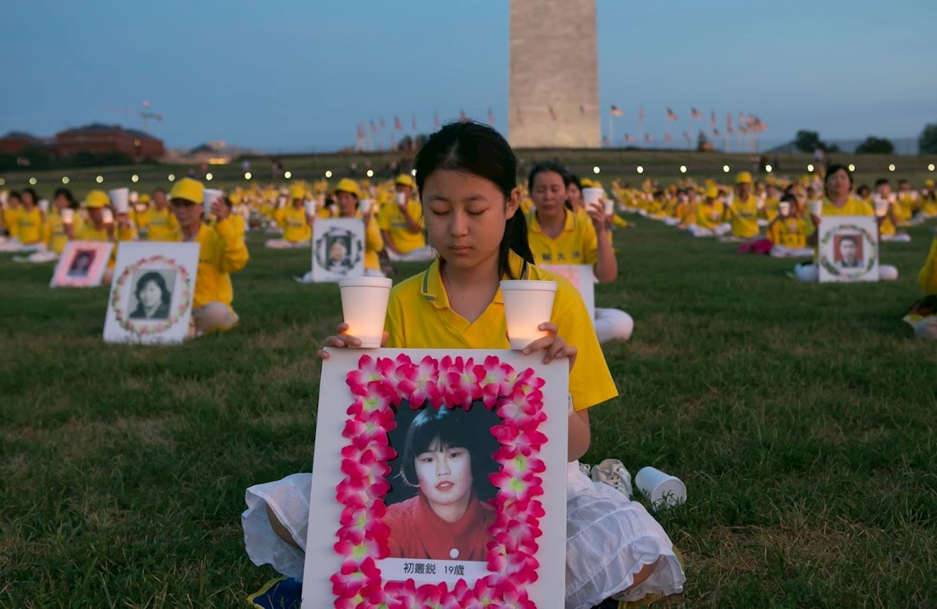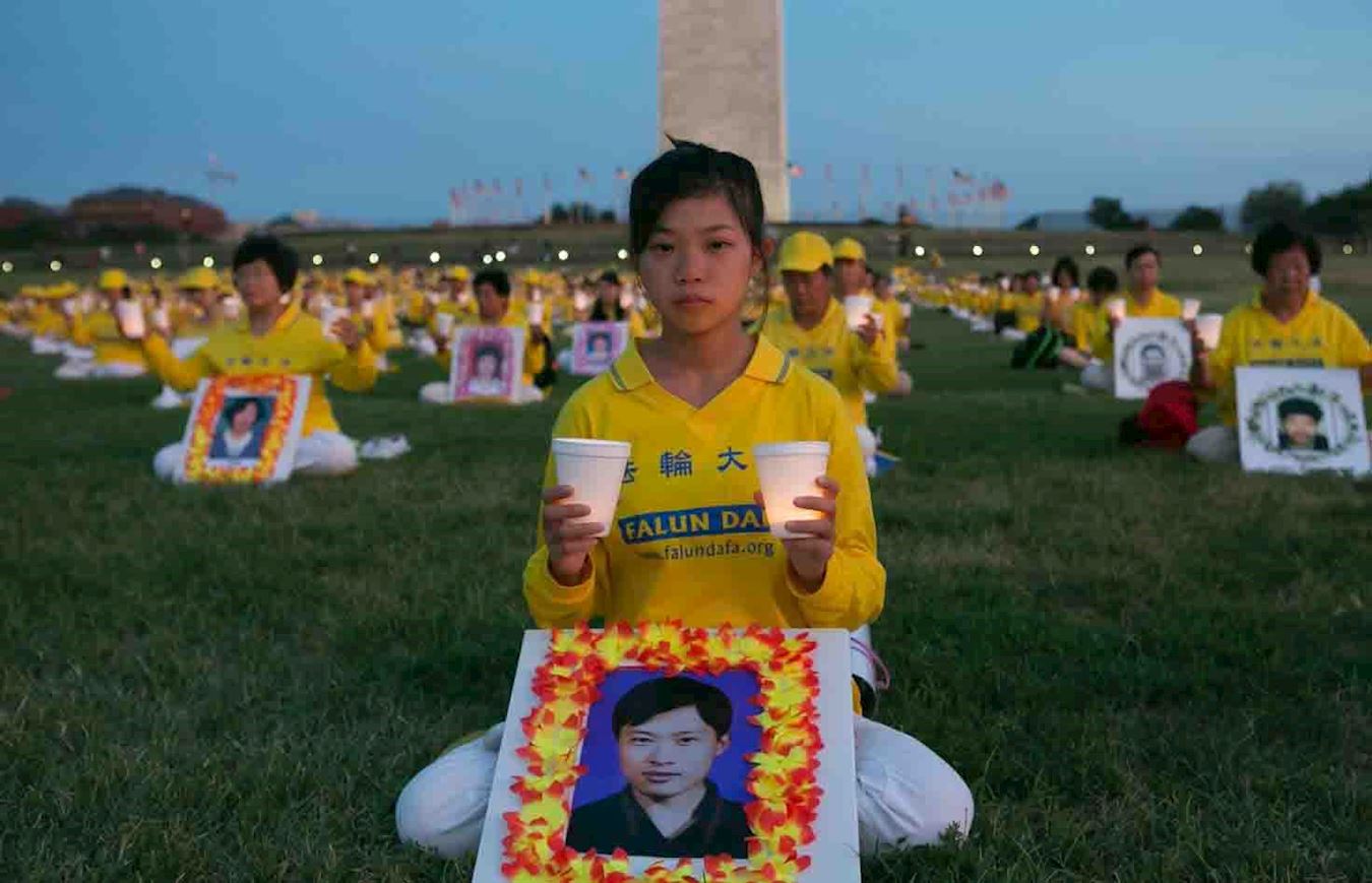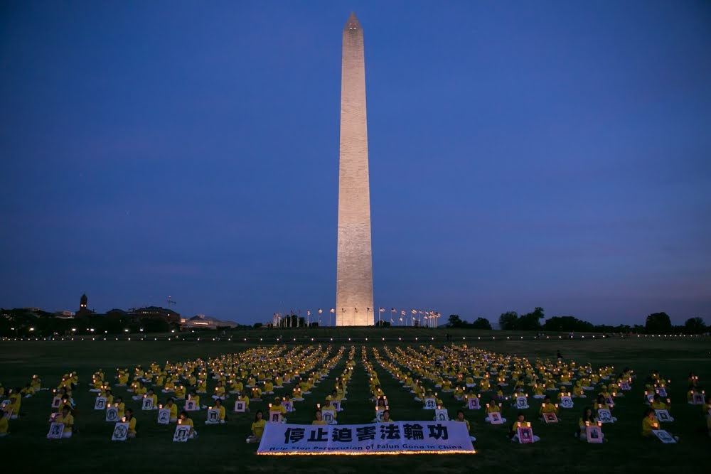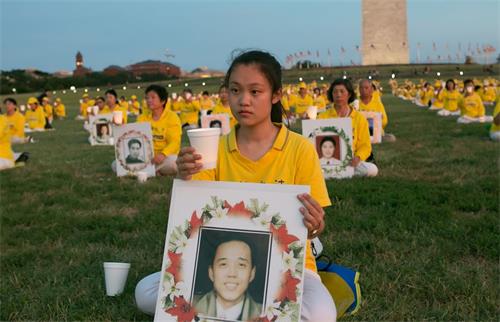 晚八点,天边洒满了落日的余晖,法轮功学员静静地坐在华盛顿纪念碑前的草坪上,他们手捧被中共迫害致死的部份法轮功学员的照片,伴随着深沉的音乐,点燃一盏盏烛光,寄托他们的哀思和敬意。最前面摆放着一个横幅,传递着他们过去十九年来始终不变的诉求——停止迫害法轮功。