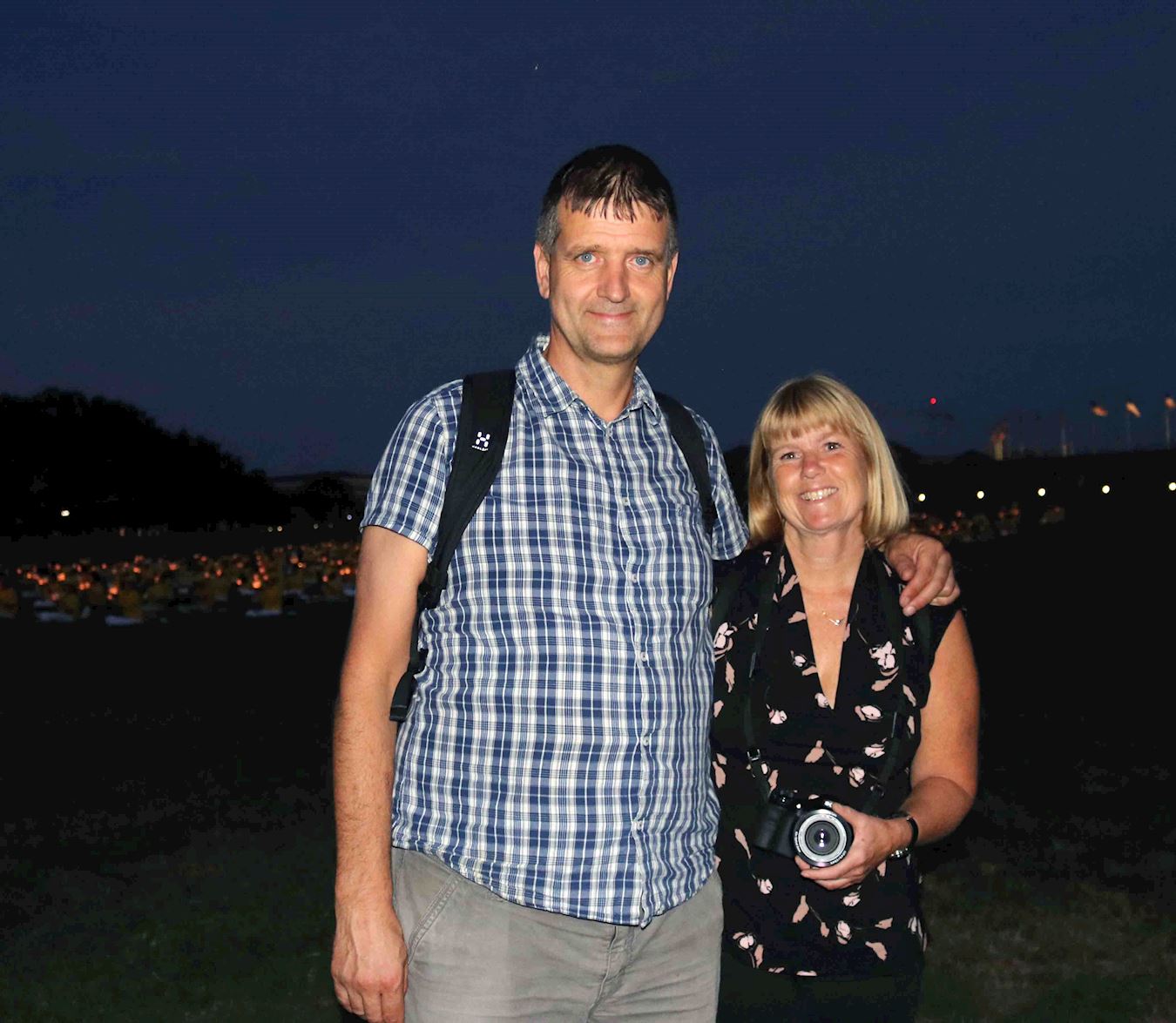 游兆和、王露蕤夫妇举起手中的蜡烛,表情凝重。他们说,虽然来到了自由社会,但是这场迫害至今仍在中国持续着,他们的内心承负着国内同修的心声。