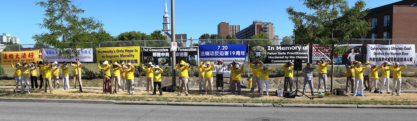 七月二十一日,当地法轮功学员在渥太华最繁华的Byward Market集体炼功,并用展板、征签等方式传播信息。