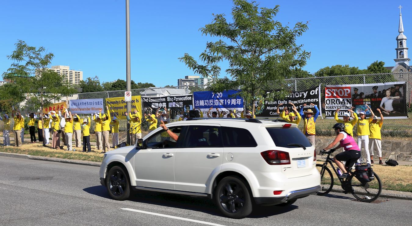 在摄氏三十多度的高温下,看到中领馆前炼功的法轮功学员,下班高峰期的过往车辆纷纷鸣笛以示支持,有的市民还把手伸出车外,向法轮功学员打出胜利的手势,以示支持。
