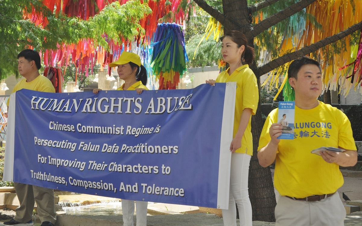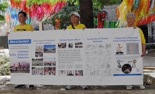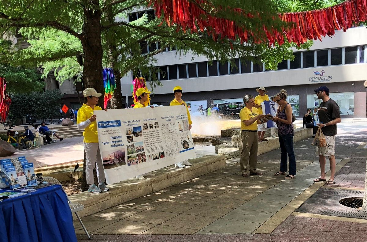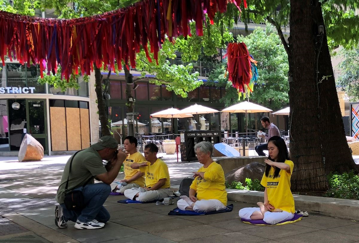 近日,正值美国南部高温酷暑天气,活动当天午时气温高达华氏一百零六度,热浪扑面。法轮功学员在沿着Main Street打着要求停止迫害和曝光中共迫害手段的横幅,也有的学员演示五套功法,庄重、祥和的场面引起过往行人的关注。