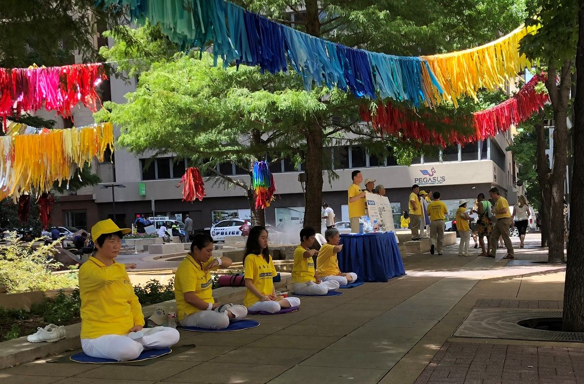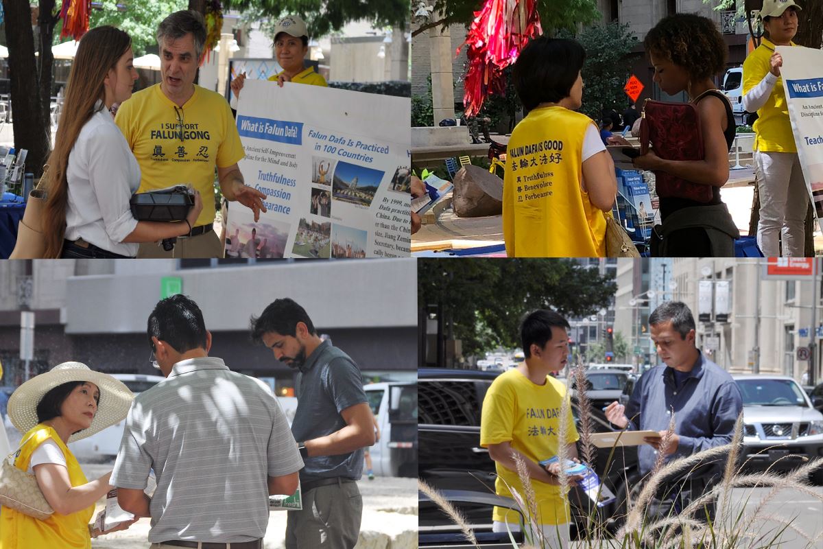 ![]() 图1~4:二零一八年七月十九日,达拉斯法轮功学员在市中心的飞马广场以炼功、打横幅、发传单、征集签名等方式向人们传法轮功真相,揭露中共对法轮功学员残酷迫害的暴行。 |