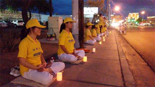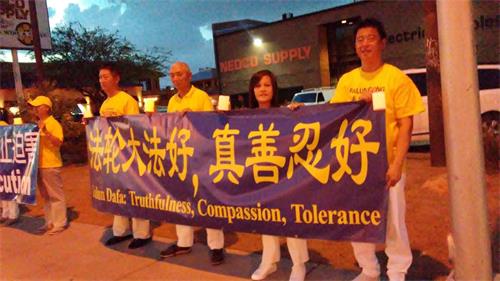 十九日当晚气温达到摄氏41度,酷热难耐,虽然夜幕逐渐笼罩,依然暑气蒸腾。当地法轮功修炼者们一部份打横幅,向路人展示中英文的“纪念七二零 呼吁停止迫害”,“法轮大法好 真善忍好”的标语,一部份演示非常祥和的法轮功第五套功法。