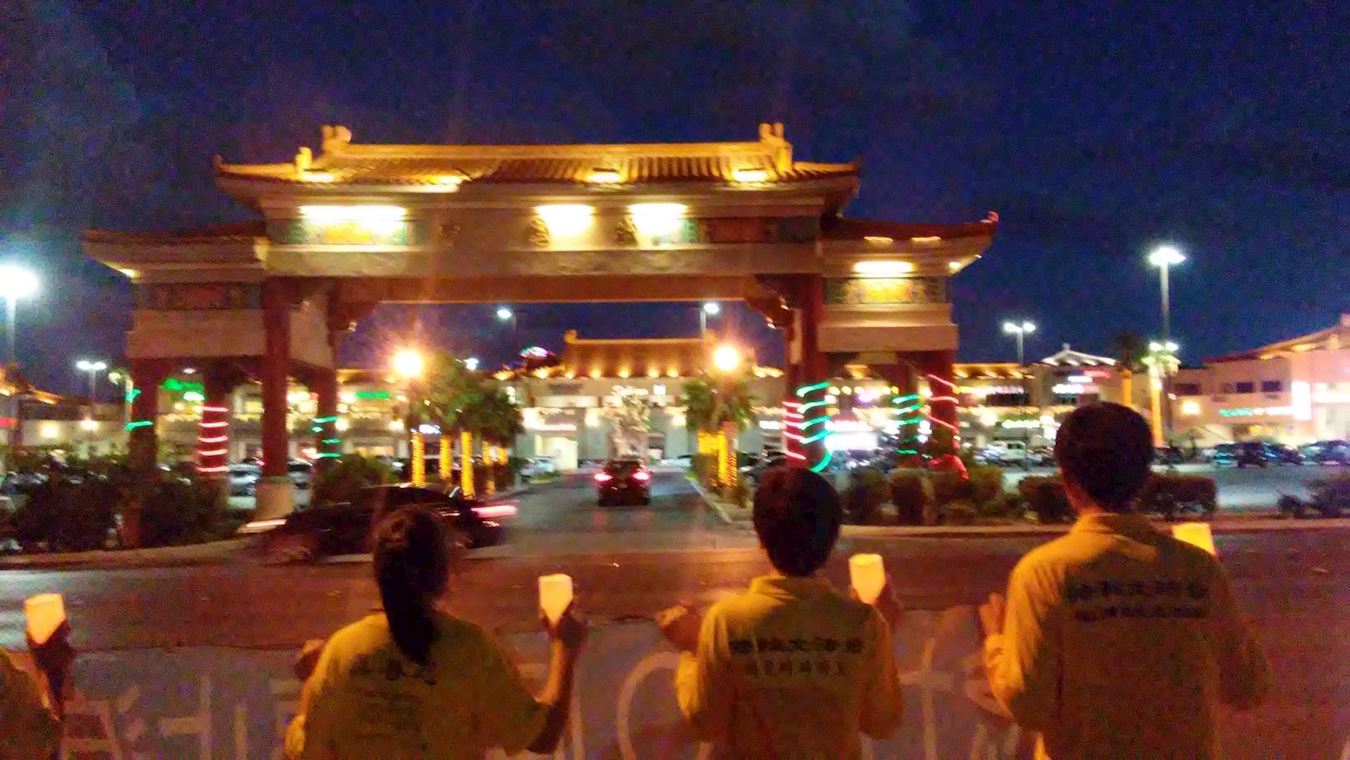![]() 图1~4:拉斯维加斯的法轮功学员齐聚在中国城对面,举行集会和烛光夜悼 |